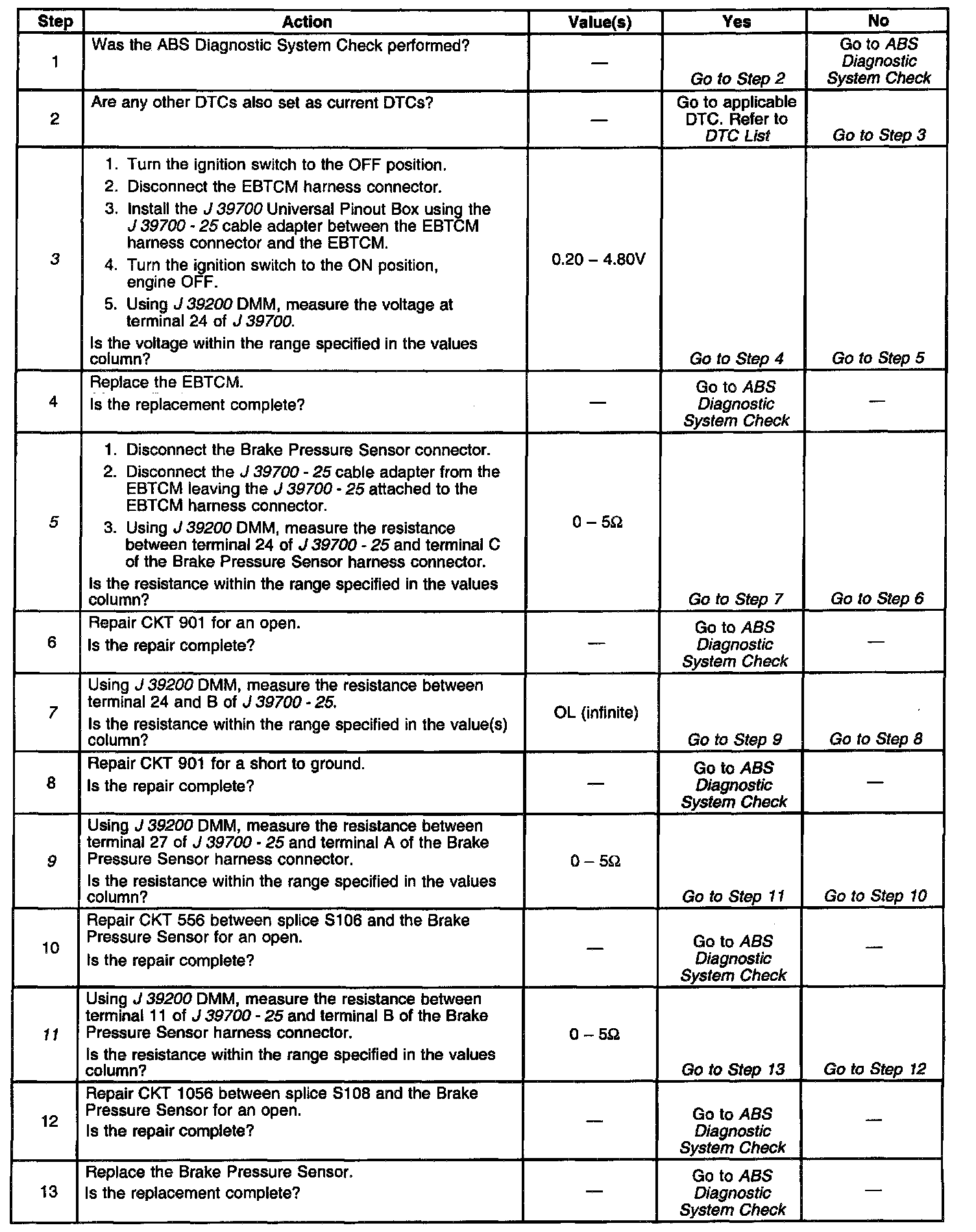 DTC C1296 can be set anytime the ignition switch is in the ON position, and the signal voltage from the Brake Pressure Sensor is less than 0.20 volts or greater than 4.80 volts.