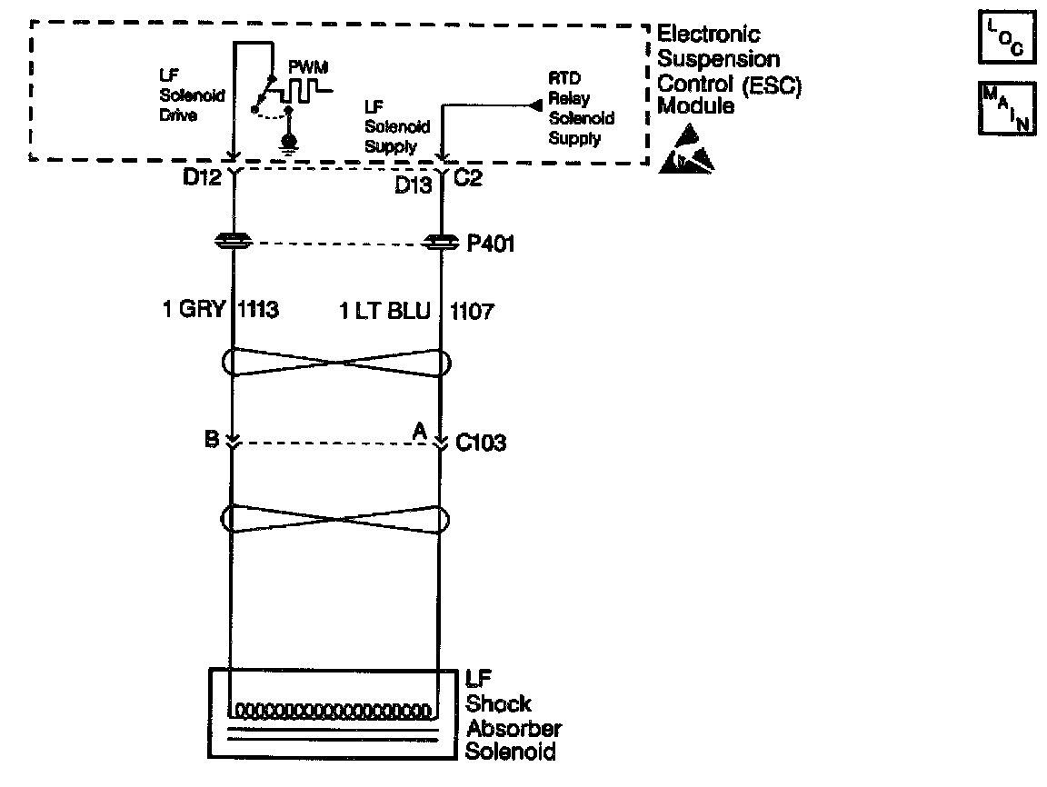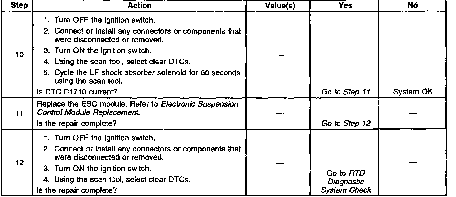 The ESC module uses the Pulse-Width Modulation (PWM) method in order to control each shock absorber solenoid. Switching the voltage ON and OFF at each shock absorber solenoid, or pulse width modulating, limits the amount of current supplied to that particular solenoid. The ESC module periodically commands each shock absorber to an set PWM duty cycle in order to override the normal PWM command. During this set PWM duty cycle, the ESC module is able to perform a diagnostic test on each shock absorber solenoid, and can determine if a malfunction is present. The ESC module is only able to detect certain malfunctions during a given state (ON or OFF). In order to test for the conditions that set a DTC C1710, the ESC module must first command the LF solenoid ON. If a high voltage level is detected in the LF solenoid drive circuit during the ON state, the test is again repeated. If the ESC module determines that the voltage levels detected in both tests are higher than expected, a malfunction is present and a DTC will set.