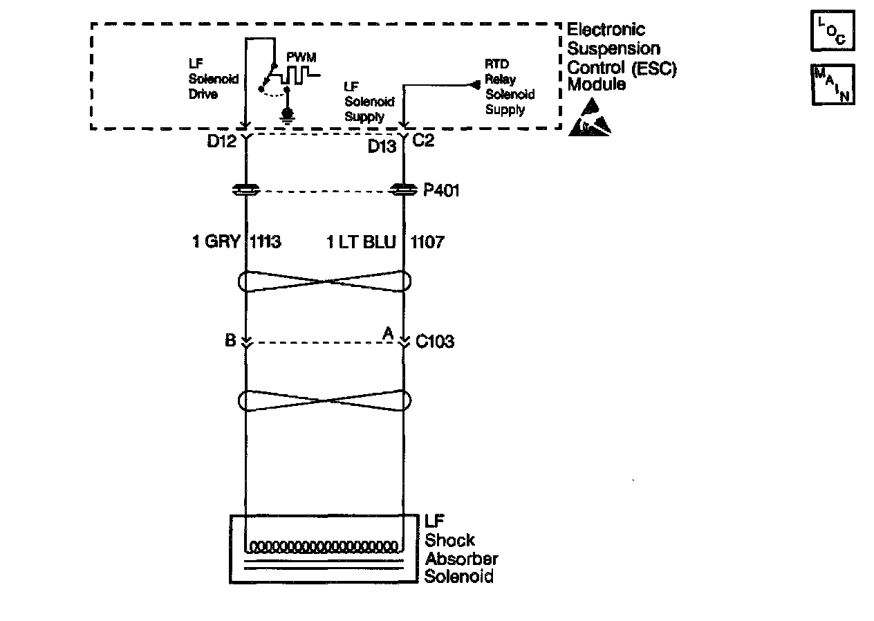 The ESC module uses the Pulse-Width Modulation (PWM) method in order to control each shock absorber solenoid. Switching the voltage ON and OFF at each shock absorber solenoid, or pulse width modulating, limits the amount of current supplied to that particular solenoid. The ESC module periodically commands each shock absorber to an set PWM duty cycle in order to override the normal PWM command. During this set PWM duty cycle, the ESC module is able to perform a diagnostic test on each shock absorber solenoid, and can determine if a malfunction is present. The ESC module is only able to detect certain malfunctions during a given state (ON or OFF). In order to test for the conditions that set a DTC C1712, the ESC module must first command the LF solenoid OFF. The ESC module must be in a command OFF state. If a low voltage level is detected in the LF solenoid drive circuit during the OFF state, the test is again repeated. If the ESC module determines that the voltage levels detected in both tests are lower than expected, a malfunction is present and a DTC will set.