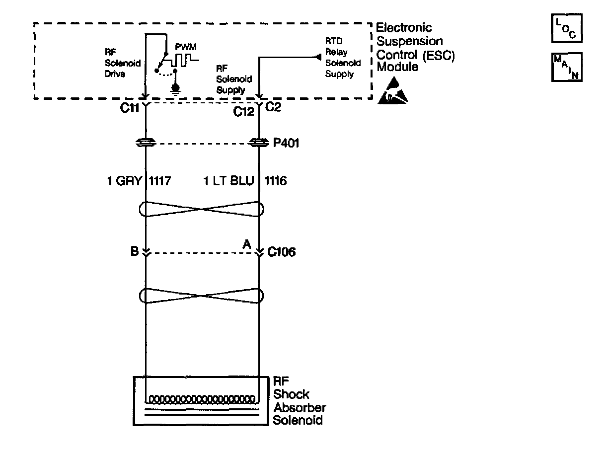 The ESC module uses the Pulse-Width Modulation (PWM) method in order to control each shock absorber solenoid. Switching the voltage ON and OFF at each shock absorber solenoid, or pulse width modulating, limits the amount of current supplied to that particular solenoid. The ESC module periodically commands each shock absorber to an set PWM duty cycle in order to override the normal PWM command. During this set PWM duty cycle, the ESC module is able to perform a diagnostic test on each shock absorber solenoid, and can determine if a malfunction is present. The ESC module is only able to detect certain malfunctions during a given state (ON or OFF). In order to test for the conditions that set a DTC C1715, the ESC module must first command the RF solenoid ON. If a high voltage level is detected in the RF solenoid drive circuit during the ON state, the test is again repeated. If the ESC module determines that the voltage levels detected in both tests are higher than expected, a malfunction is present and a DTC will set.