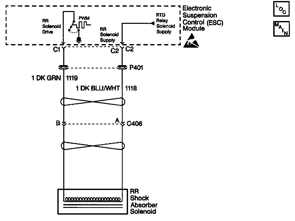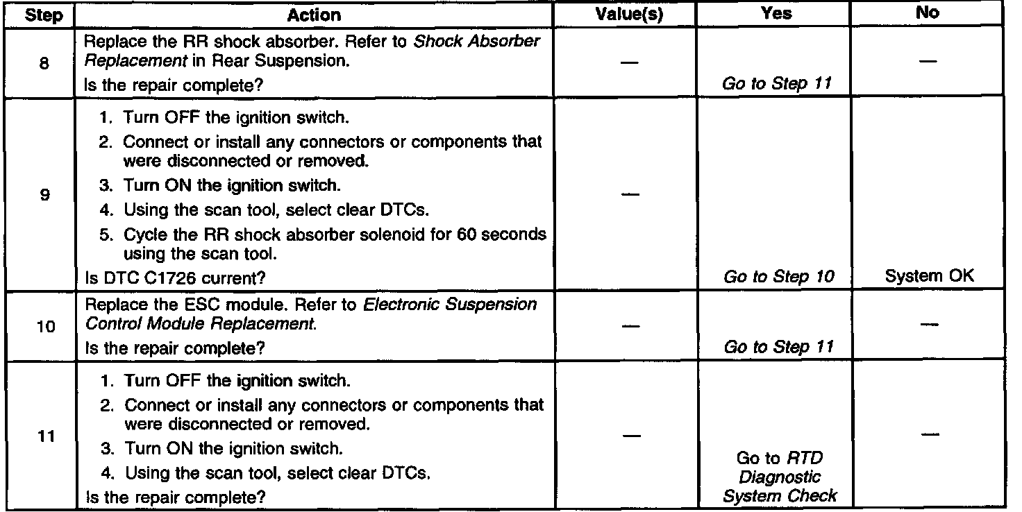 The ESC module uses the Pulse-Width Modulation (PWM) method in order to control each shock absorber solenoid. Switching the voltage ON and OFF at each shock absorber solenoid, or pulse width modulating, limits the amount of current supplied to that particular solenoid. The ESC module periodically commands each shock absorber to a set PWM duty cycle in order to override the normal PWM command. During this set PWM duty cycle, the ESC module is able to perform a diagnostic test on each shock absorber solenoid, and can determine if a malfunction is present. The ESC module is only able to detect certain malfunctions during a given state (ON or OFF). In order to test for the conditions that set a DTC C1726, the ESC module must first command the RR solenoid OFF. The ESC module must be in a command OFF state. If a low voltage level is detected in the RR solenoid drive circuit during the OFF state, the test is again repeated. If the ESC module determines that the voltage levels detected in both tests are lower than expected, a malfunction is present and a DTC will set.