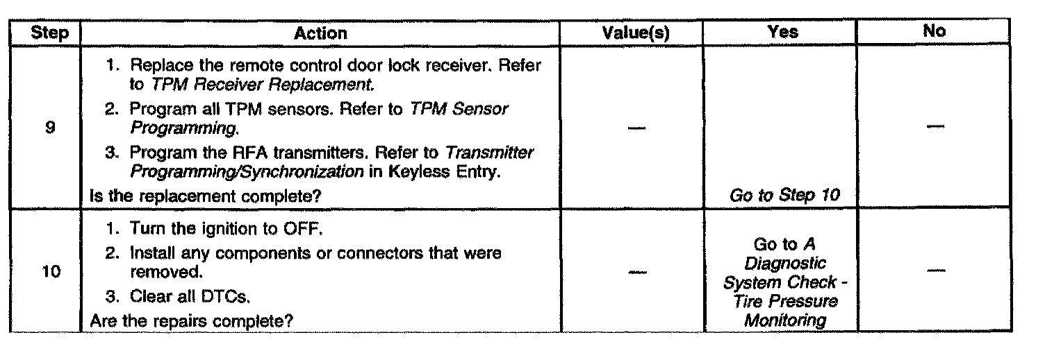 - Clear the receiver's diagnostic memory before road testing the vehicle whenever a TPM sensor is replaced in order to avoid reading the original DTC stored in the memory.