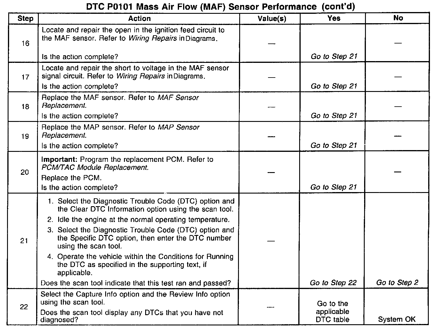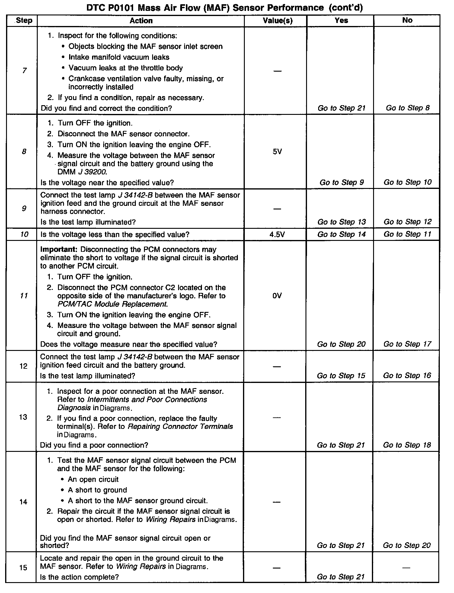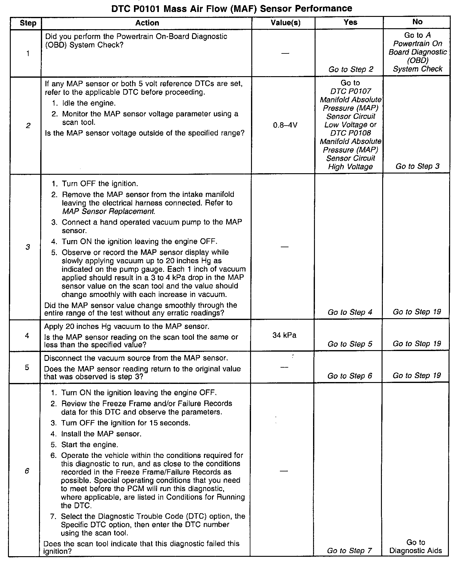 2. The MAF system performance or rationality diagnostic uses the MAP sensor signal along with other inputs in order to calculate an expected airflow rate. The PCM then compares the expected flow rate to the actual measured airflow from the MAF sensor. The first few steps of this table verify that the MAP sensor is working properly. Correct any MAP sensor DTCs first.