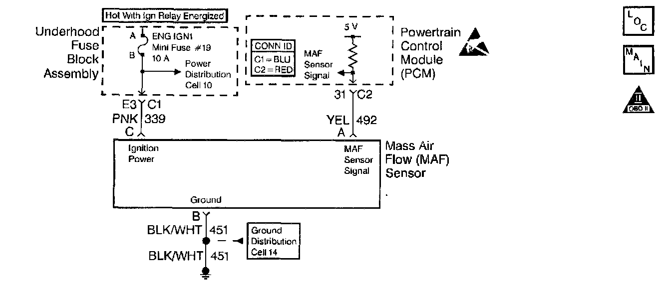 The Mass Air Flow (MAF) sensor measures the amount of air ingested by the engine. The direct measurement of the air entering the engine is more accurate than calculating the airflow from the MAP, the IAT and the engine speed (speed/density). The MAF sensor has a battery feed, ground, and a signal circuit.