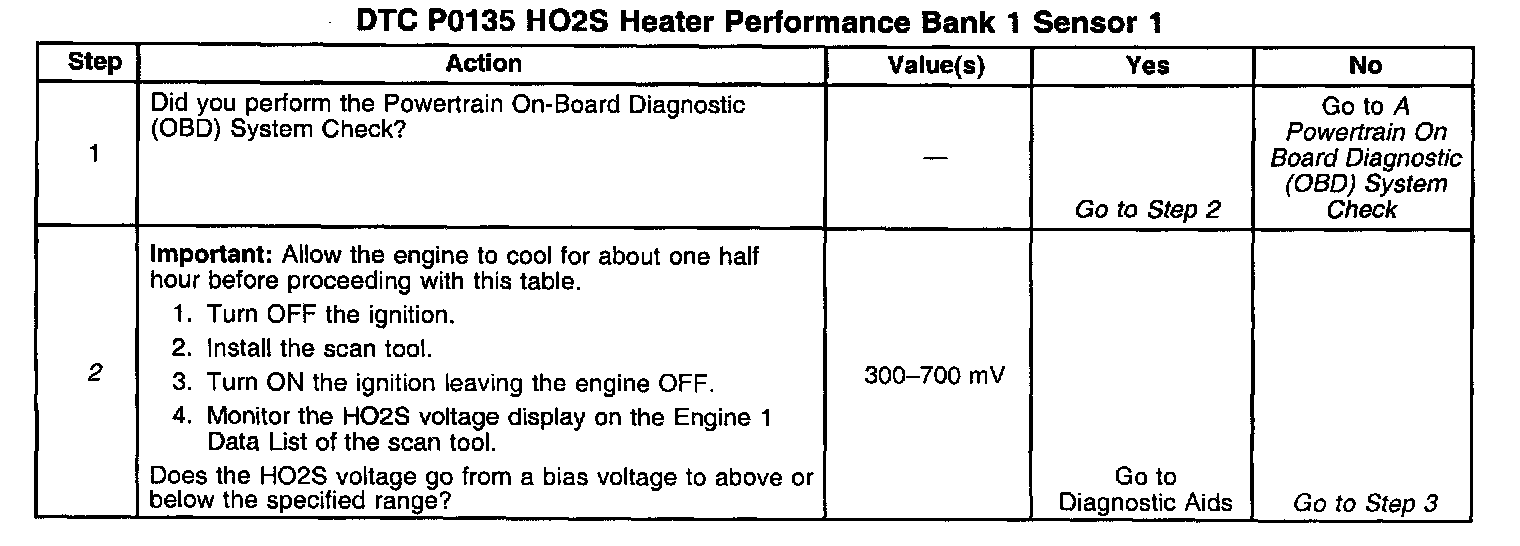 2. Allow the engine to cool before performing this test. If the sensor is at the operating temperature the HO2S voltage will stay high or low. If the HO2S voltage stays between 300-700 mV indicates the HO2S heater is inoperative.
