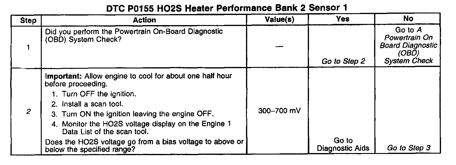 2. The engine must be allowed to cool. The HO2S may be at operating temperature and no drop or rise in HO2S voltage will occur. If the HO2S voltage stays between 300-700 mV indicates the HO2S heater is inoperative.