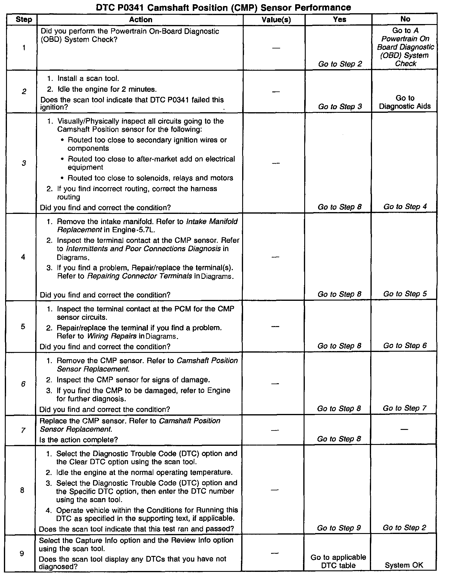 The numbers below refer to the step numbers on the diagnostic table.