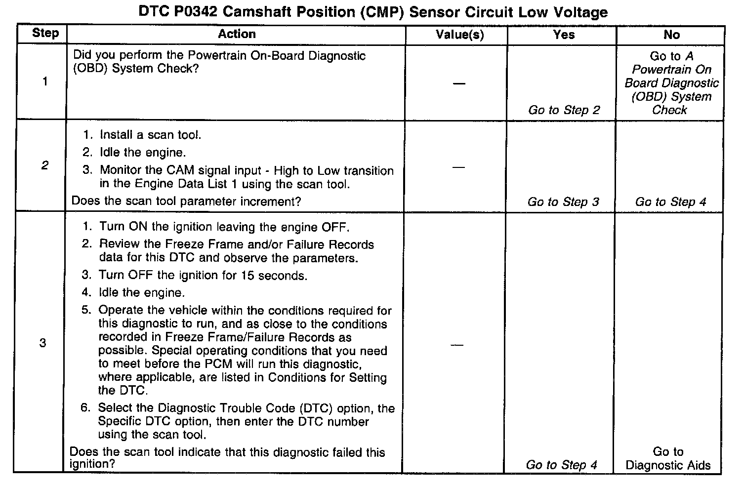The numbers below refer to the step numbers on the diagnostic table.