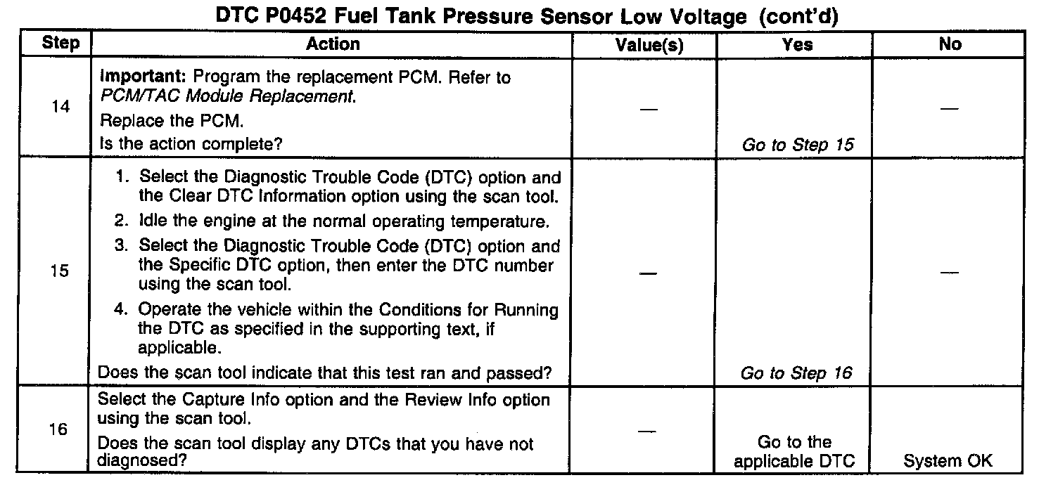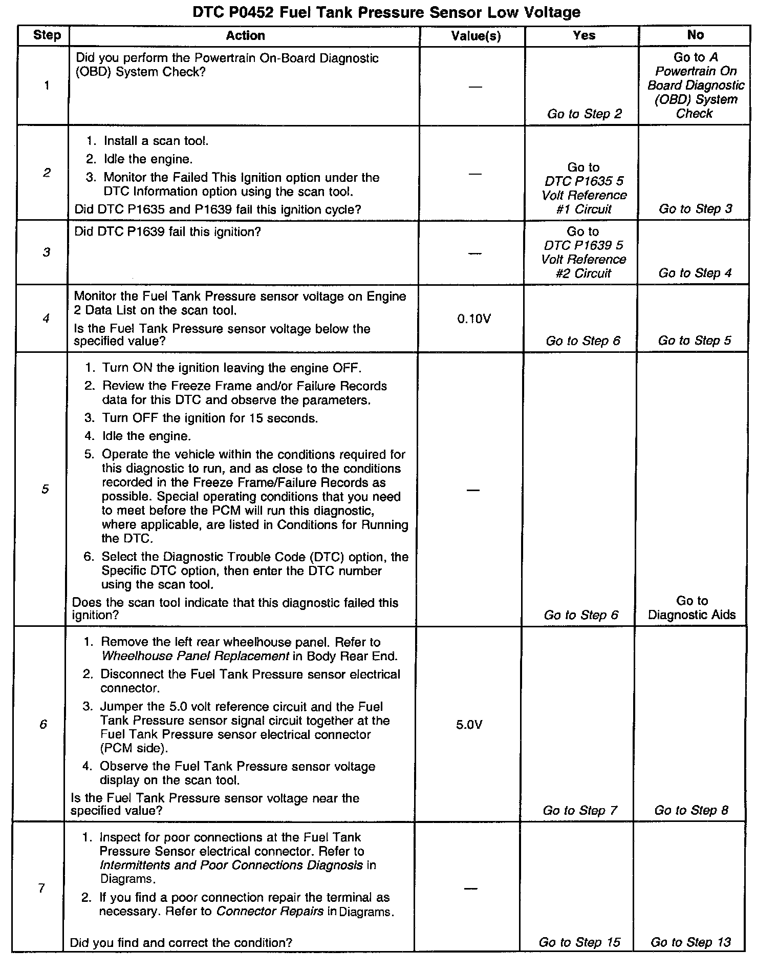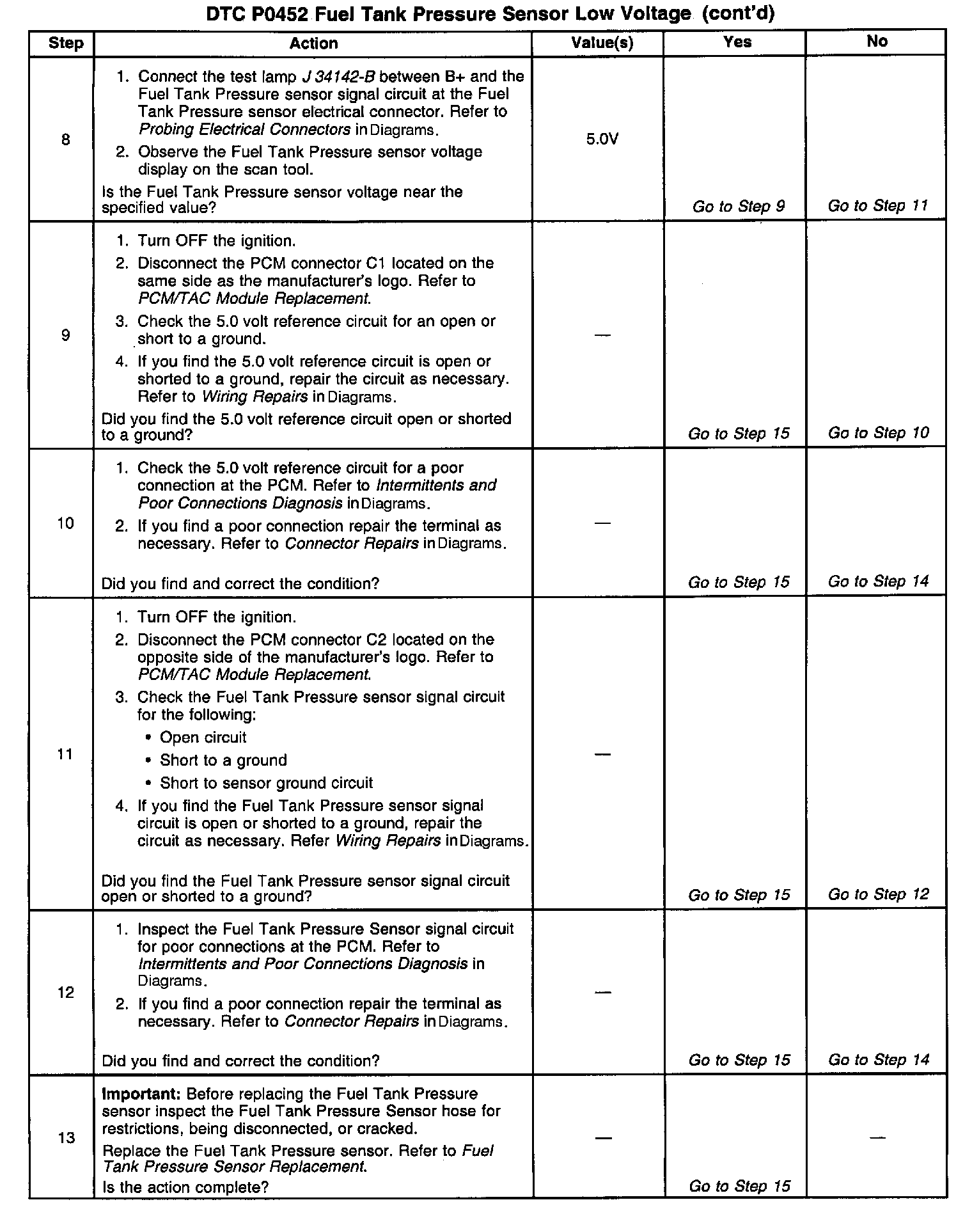The PCM provides a 5.0 volt reference and a ground. The Fuel Tank Pressure sensor signal varies between ground and 5.0 volts as the fuel tank pressure varies. The Fuel Tank Pressure sensor voltage increases as the fuel tank pressure decreases. The Fuel Tank Pressure sensor voltage decreases as the fuel tank pressure increases. The PCM uses the Fuel Tank Pressure sensor voltage for EVAP system leak detection. This DTC sets when the Fuel Tank Pressure sensor signal goes below a predetermined value.