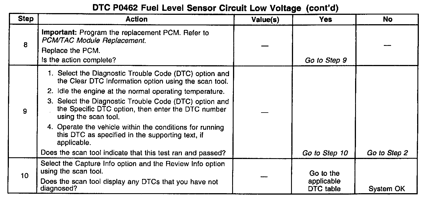 ^ Depending on the current fuel level, it may be difficult to locate a malfunctioning sending unit. The malfunction may only occur when the fuel level is full or near empty. The fuel sending unit may need to be removed for further diagnosis. A Fuel Level sensor that has an intermittent condition causes this DTC to set. Remove the Fuel Level sensor in order to test the resistance of the sensor. The resistance of the sensor should change from 40 to 250 ohms as the float arm is moved from the empty to full positions. Replace the sensor if the resistance did not change or is out of range.