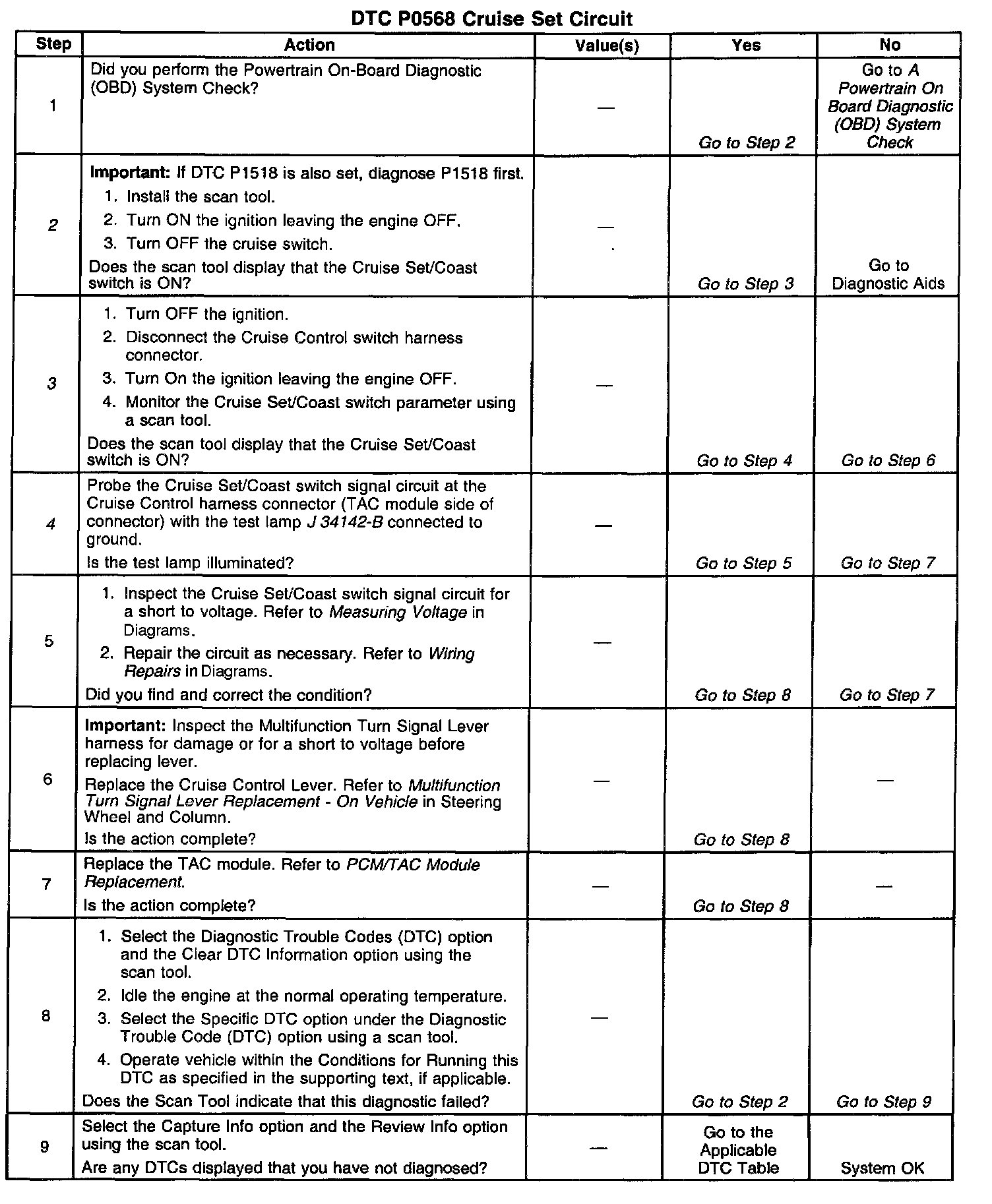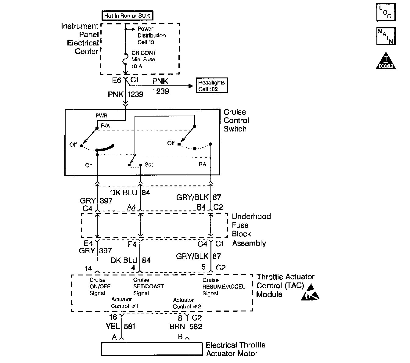 The cruise Set/Coast switch is an input to the Throttle Actuator Control (TAC) Module. The cruise information is supplied to the PCM via the serial data circuit. This input allows the PCM/TAC module to control and hold a requested speed. The Cruise Set/Coast switch sends ignition voltage to the TAC module when the switch is closed (ON). This DTC sets if the PCM/TAC module senses a voltage on the Set/Coast switch circuit when the voltage is not expected.