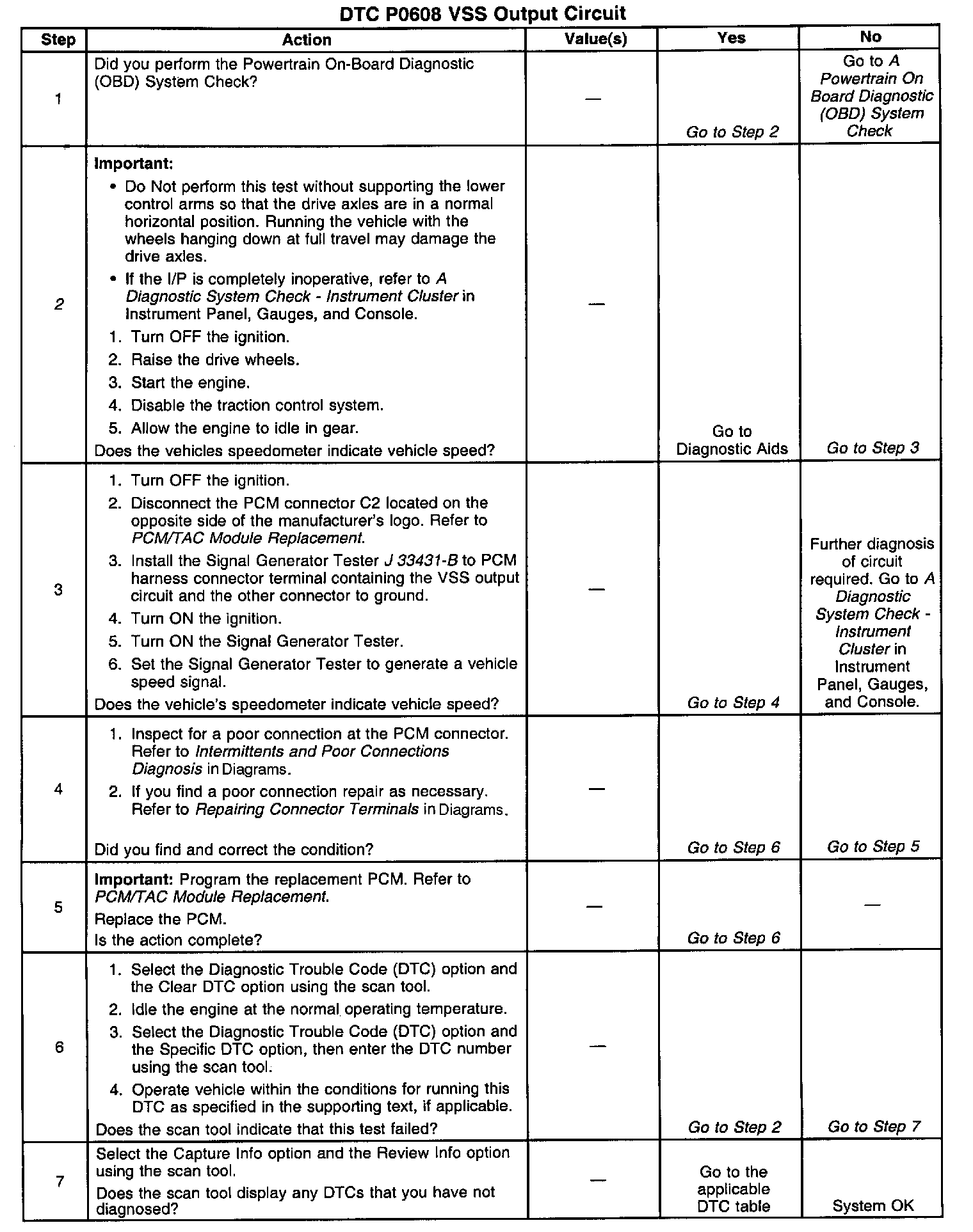 A voltage is supplied to the Vehicle Speed Output circuit. The PCM creates the Vehicle Speed Output signal by pulsing the circuit to ground at a predetermined hertz rate. The PCM pulses the circuit at the same rate as the VSS input signal. The PCM monitors the voltage on the Vehicle Speed output circuit. If the PCM determines the voltage is out of the normal operating range, a DTC sets.