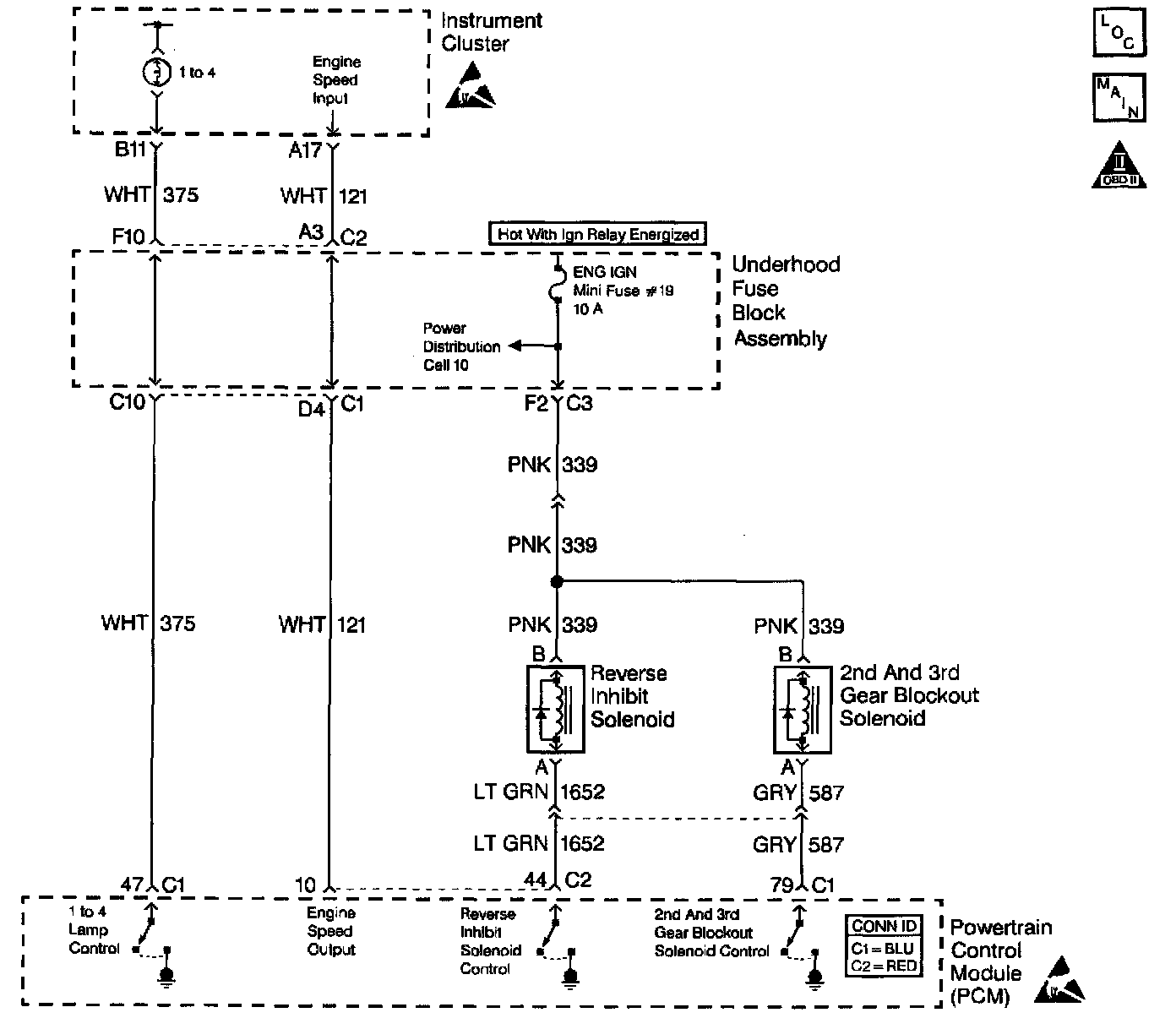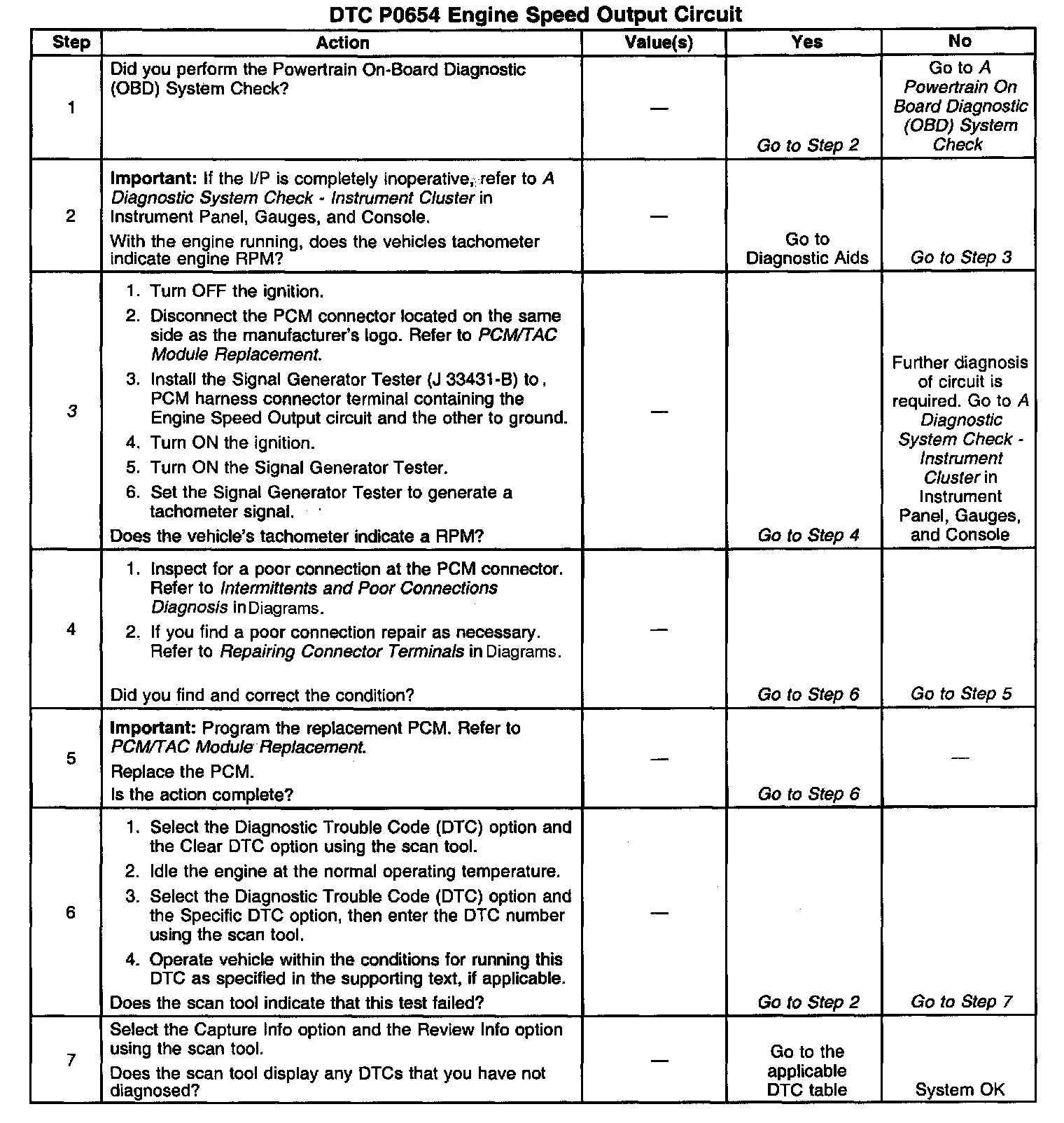 3. Further circuit diagnosis may require I/P removal. Test the circuit from the PCM to the tachometer for being open, shorted to ground or, voltage. If you can not find any trouble, follow the appropriate I/P diagnostic procedure.