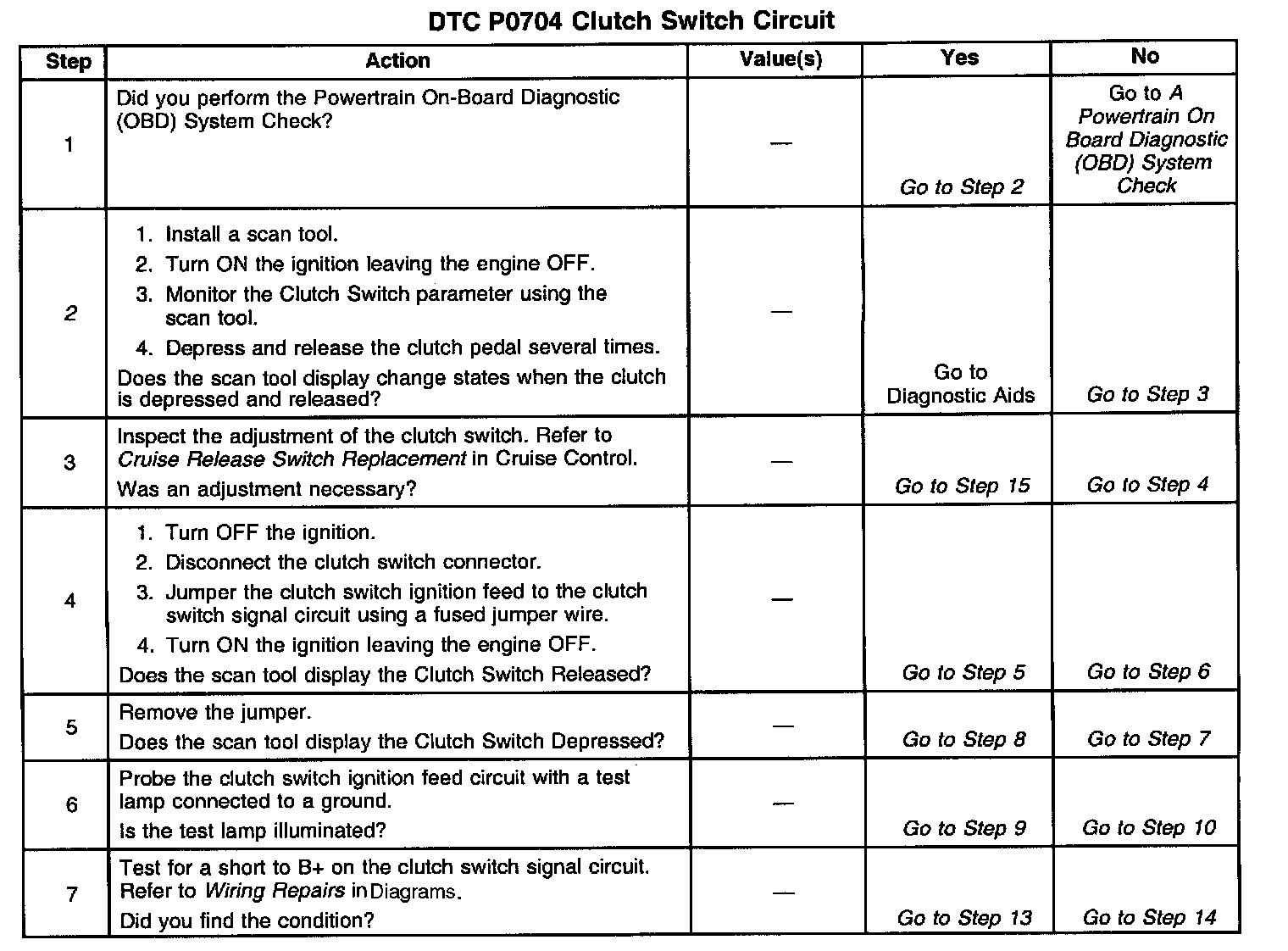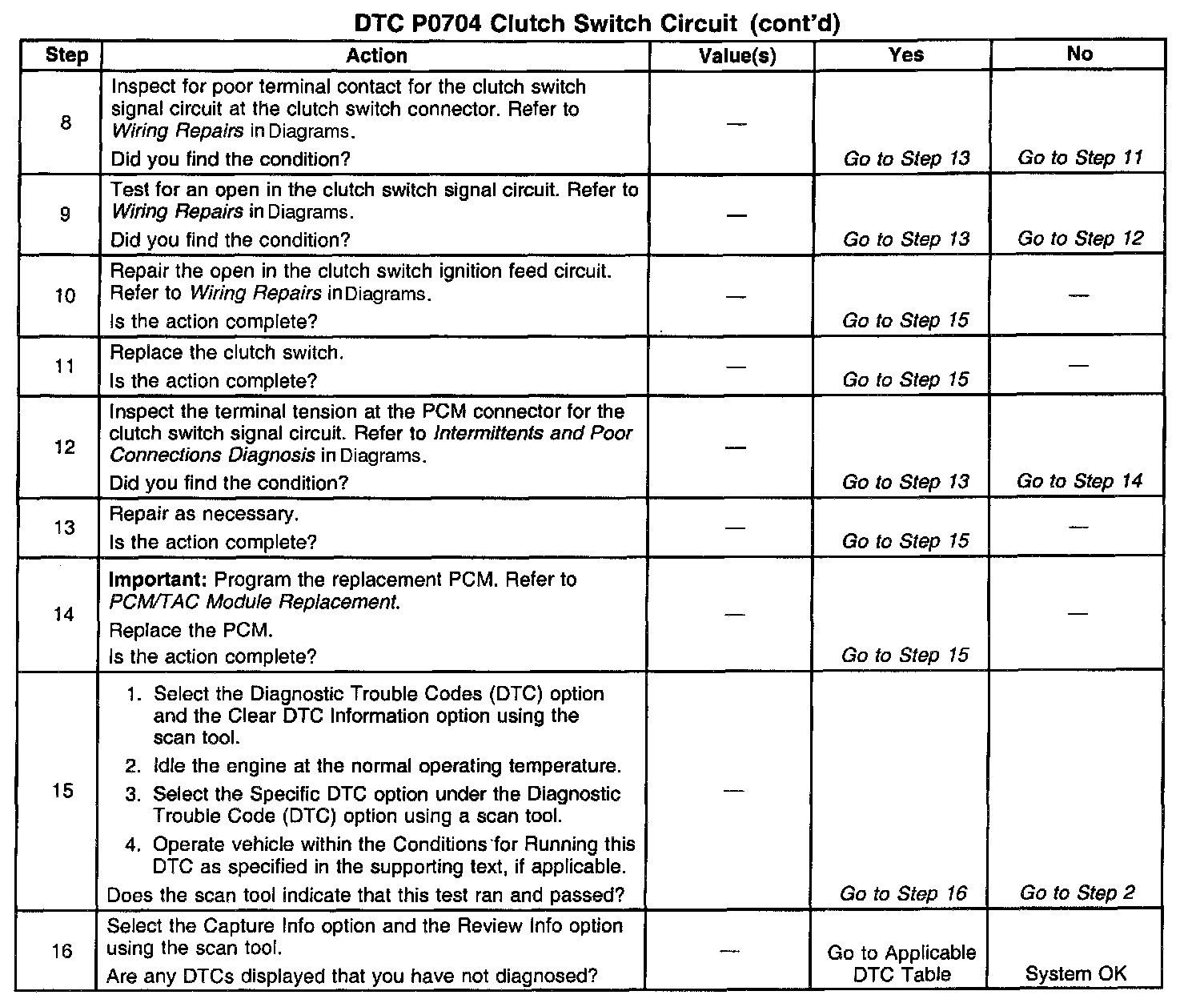 This DTC determines if the Transmission Clutch switch has failed by looking for a clutch switch transition during a predetermined drive cycle.