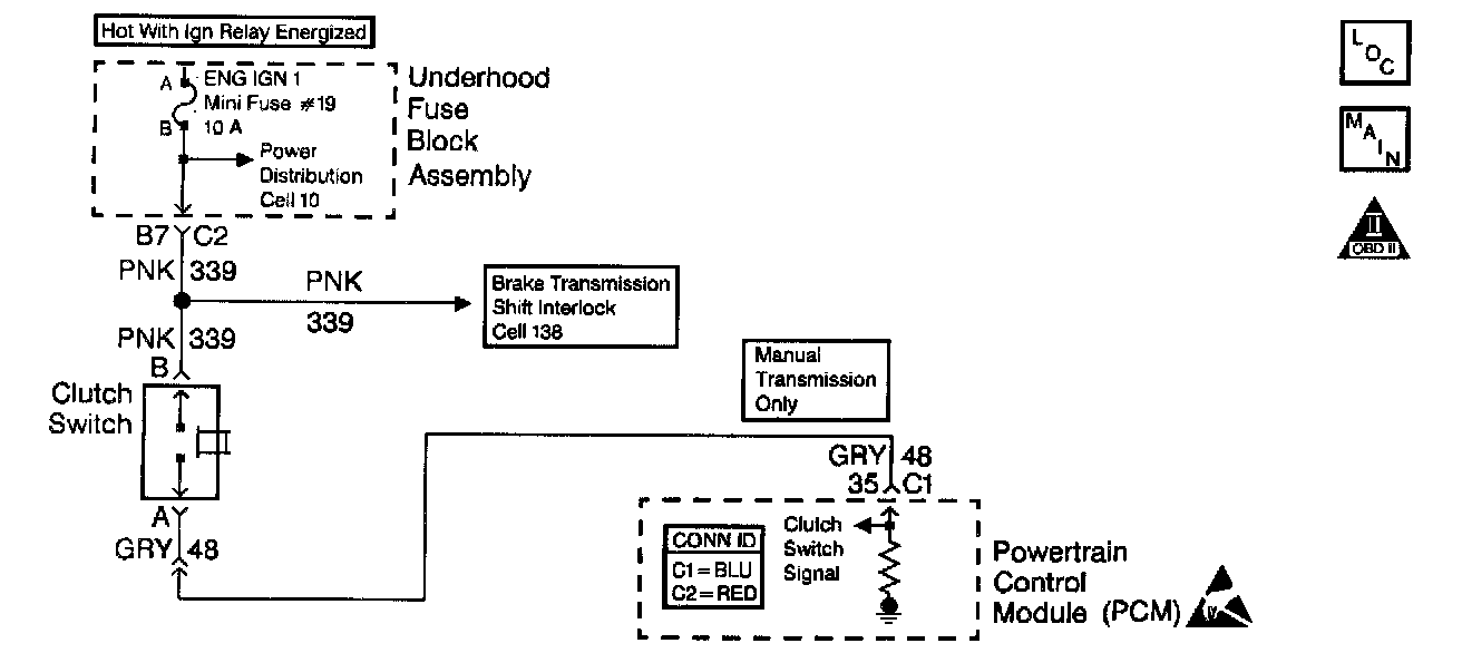The clutch switch is a normally closed switch (clutch pedal released). The PCM detects an ignition voltage on the clutch switch circuit when the clutch switch is closed. The PCM detects 0 volts on the clutch switch circuit when the clutch switch is open (clutch pedal depressed).