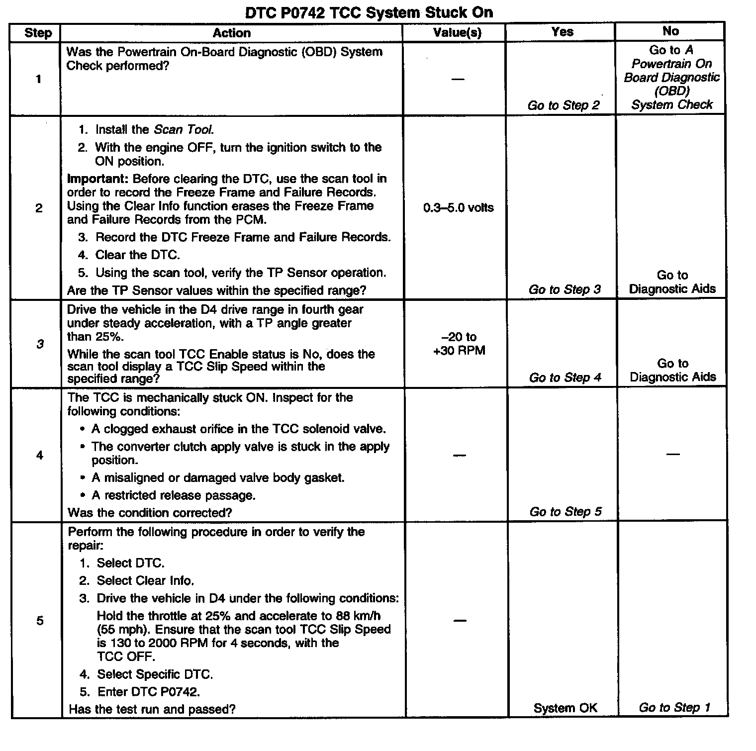When the PCM detects low torque converter slip when the PCM commands the TCC OFF, then DTC P0742 sets. DTC P0742 is a type B DTC.