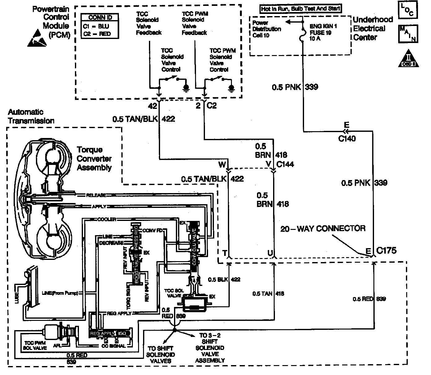 The torque converter clutch (TCC) solenoid valve is a normally-open exhaust valve that is used with the torque converter clutch pulse width modulation (TCC PWM) solenoid valve in order to control fluid acting on the converter clutch apply valve. The TCC solenoid valve attaches to the transmission case assembly extending into the pump cover. When grounded (energized) by the powertrain control module (PCM), the TCC solenoid valve stops converter signal oil from exhausting. This causes converter signal oil pressure to increase and move the converter clutch apply valve against spring force and into the apply position. In this position, release fluid is open to an exhaust port and converter feed fluid fills the apply fluid circuit. The converter feed fluid applies the TCC. When the PCM no longer provides a ground path, the TCC solenoid valve de-energizes and apply fluid exhausts, releasing the TCC.
