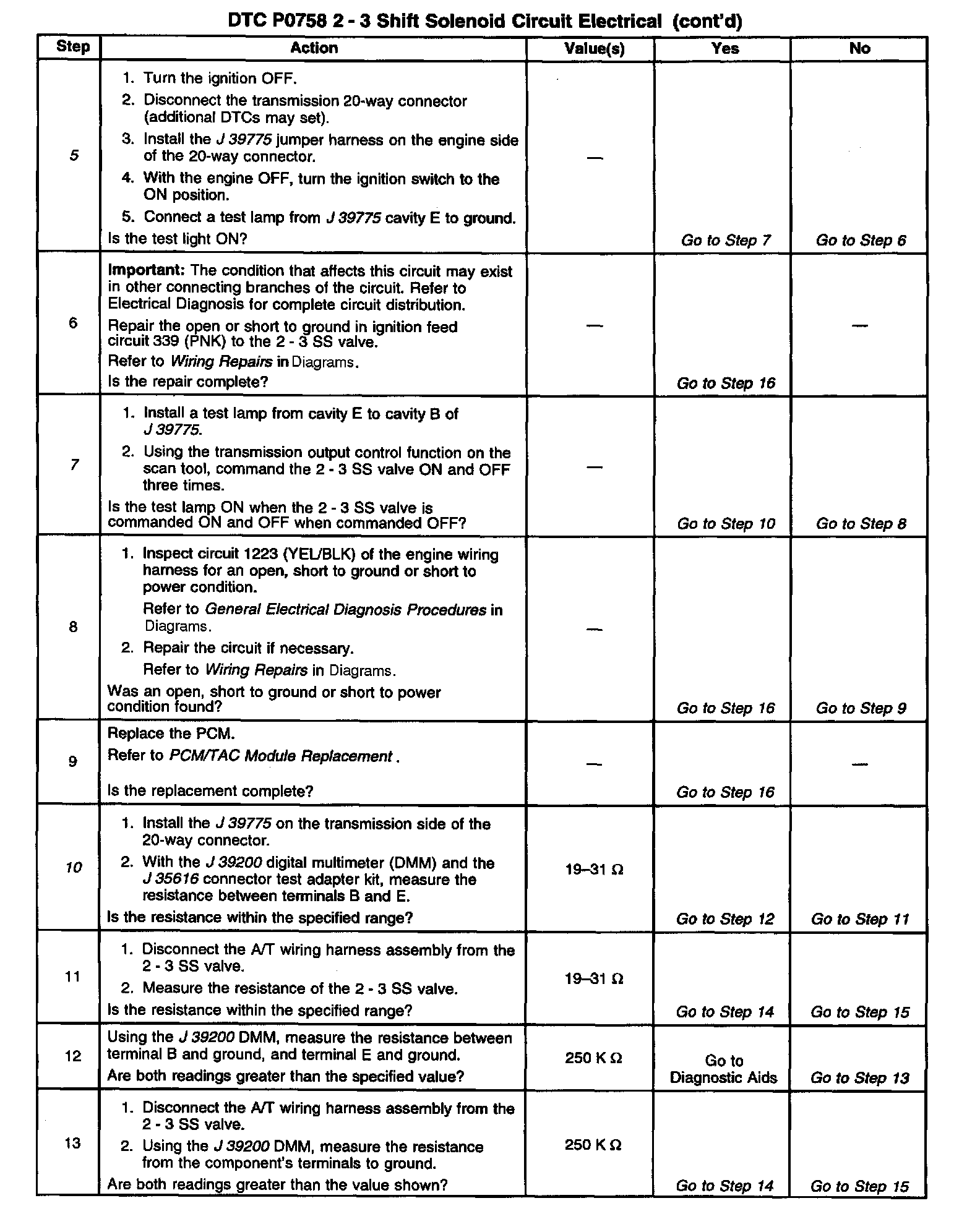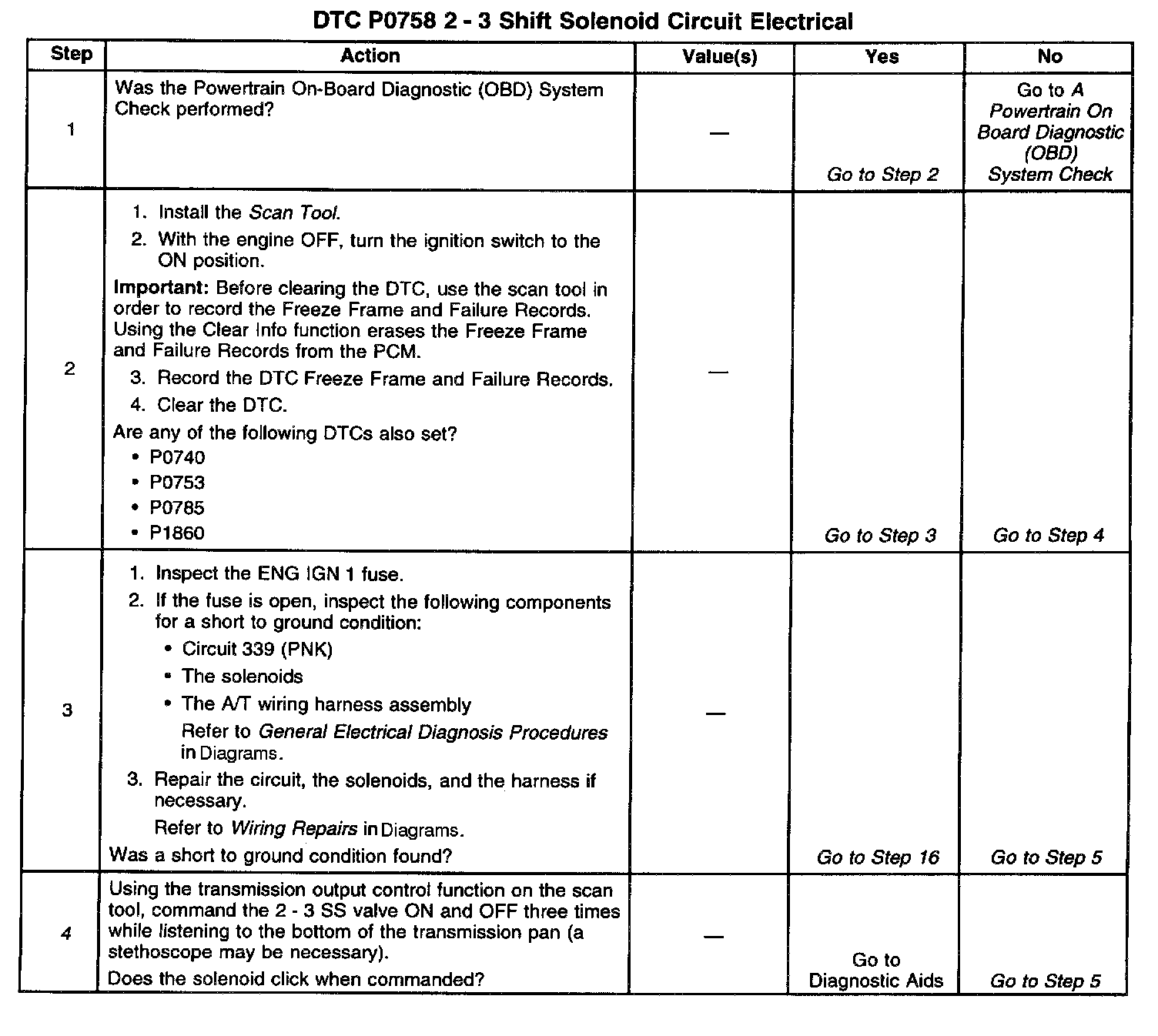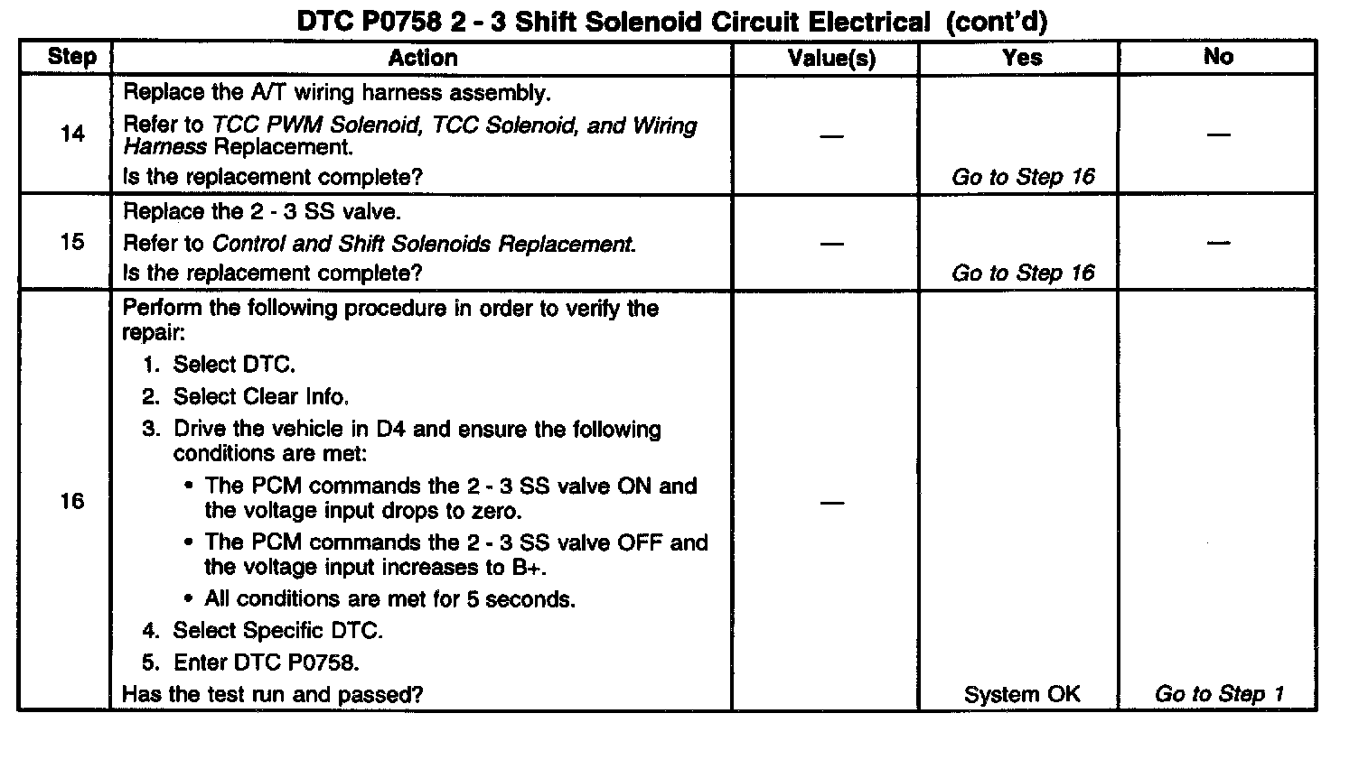 When the PCM detects a continuous open or short to ground in the 2 - 3 SS valve circuit or the 2 - 3 SS valve, then DTC P0758 sets. DTC P0758 is a type A DTC.