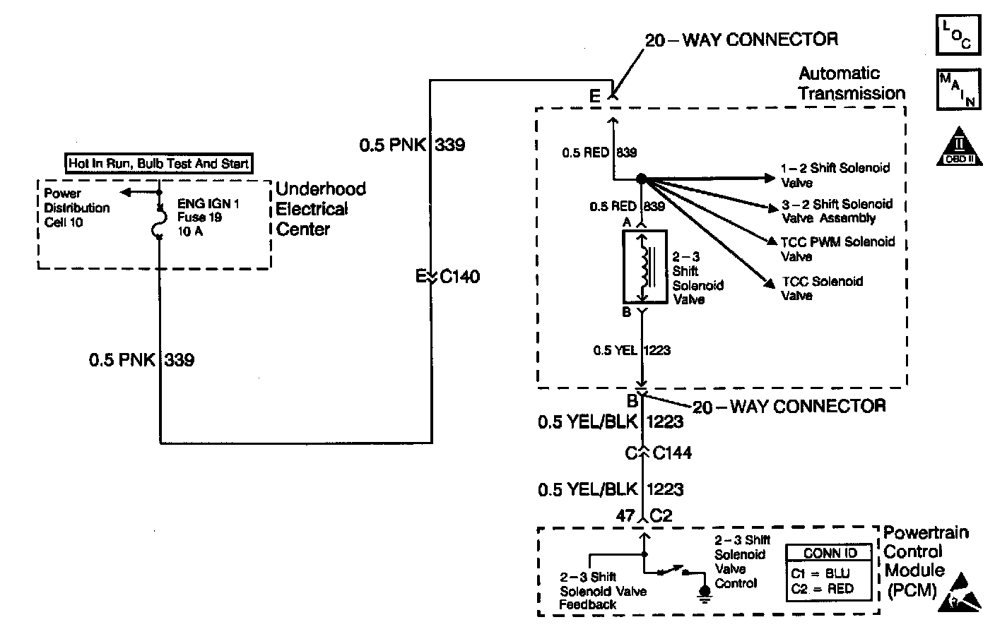The 2 - 3 shift solenoid (SS) valve controls the fluid flow acting on the 2 - 3 shift valves. The 2 - 3 SS valve is a normally-open exhaust valve that is used with the 1 - 2 SS valve in order to allow four different shifting combinations. The solenoid attaches to the control valve body within the transmission. The 2 - 3 SS valve receives ignition voltage through circuit 339. The powertrain control module (PCM) controls the solenoid by providing the ground path on circuit 1223.