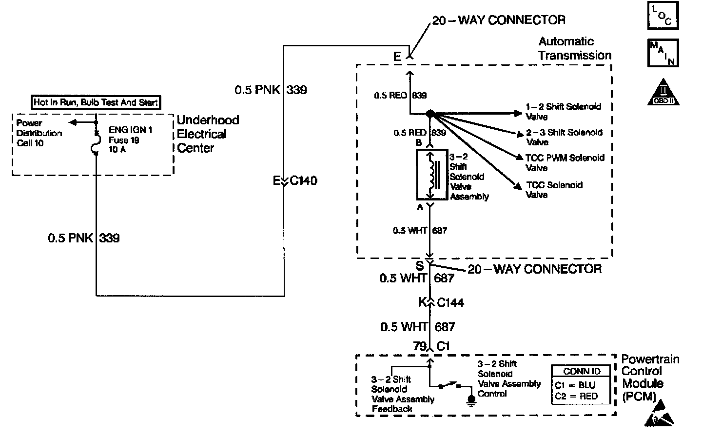 The 3 - 2 shift solenoid (SS) valve assembly is a normally-closed, 3-port, on/off device that controls the 3 - 2 downshift. The solenoid attaches to the control valve body within the transmission. The solenoid receives ignition voltage through circuit 339. The powertrain control module (PCM) controls the solenoid by providing a ground path on circuit 687. During a 3 - 2 downshift, the 2 - 4 band applies as the 3 - 4 clutch releases. The PCM varies the timing between the 3 - 4 clutch release and the 2 - 4 band apply depending on the vehicle speed and the throttle position.