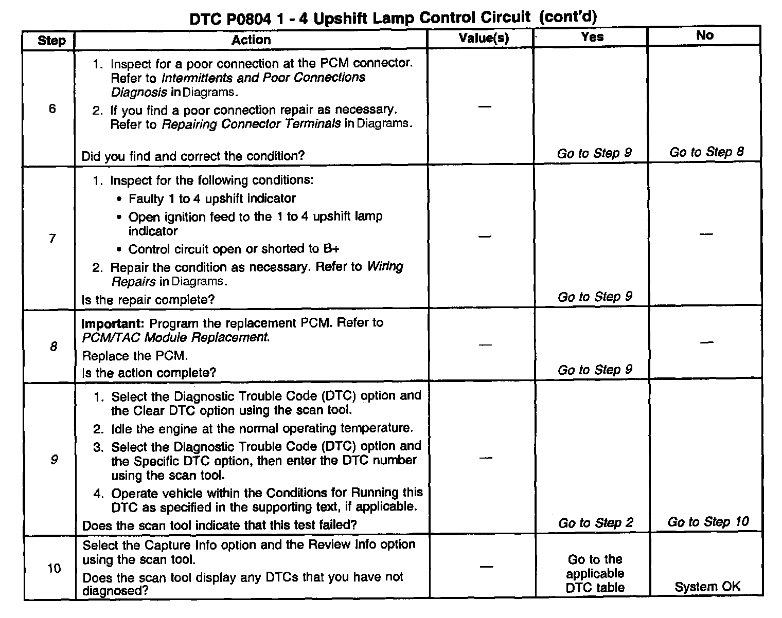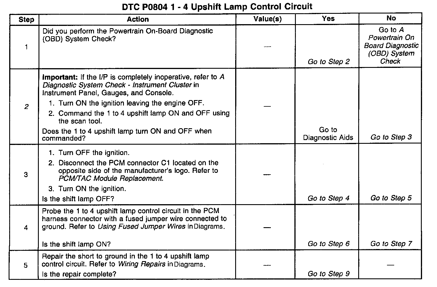 An ignition voltage is supplied directly to the 1-4 Upshift Lamp. The PCM controls the lamp by grounding the control circuit via an internal switch called a driver. The driver supplies the ground for the component being controlled. Each driver has a fault line which the PCM monitors. When the PCM commands a component ON, the voltage of the control circuit should be low, near 0 volts. When the PCM commands the control circuit to a component OFF, the voltage potential of the circuit should be high, near battery voltage. If the fault detection circuit senses a voltage other than what is expected, the fault line status changes causing the DTC to set.