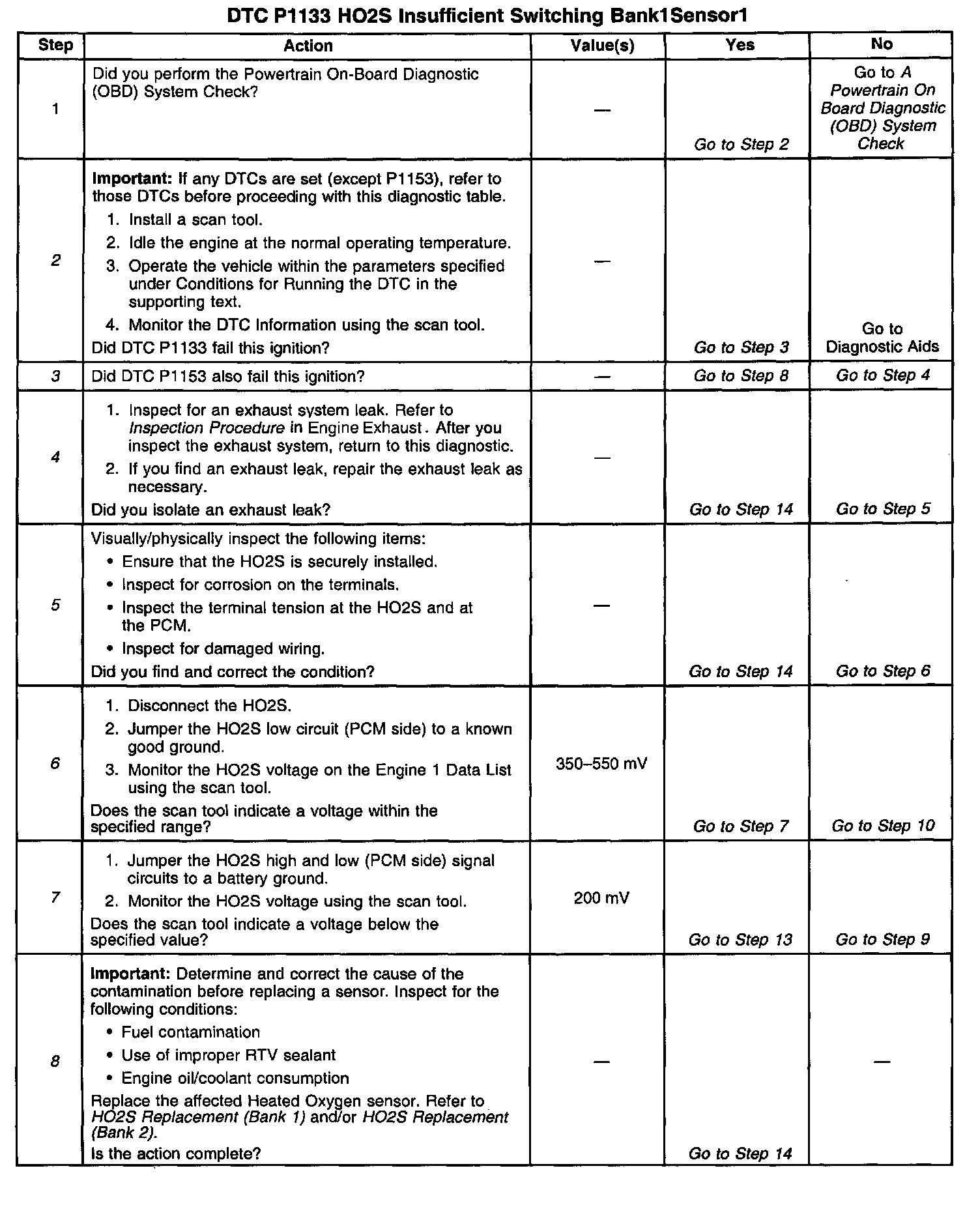 The PCM monitors the Heated Oxygen Sensor (HO2S) activity for 100 seconds. During this monitor period, the PCM counts the number of times that the HO2S switches form rich to lean and lean to rich. When the PCM determines that the HO2S did not switch enough times, a DTC P1133 will set.