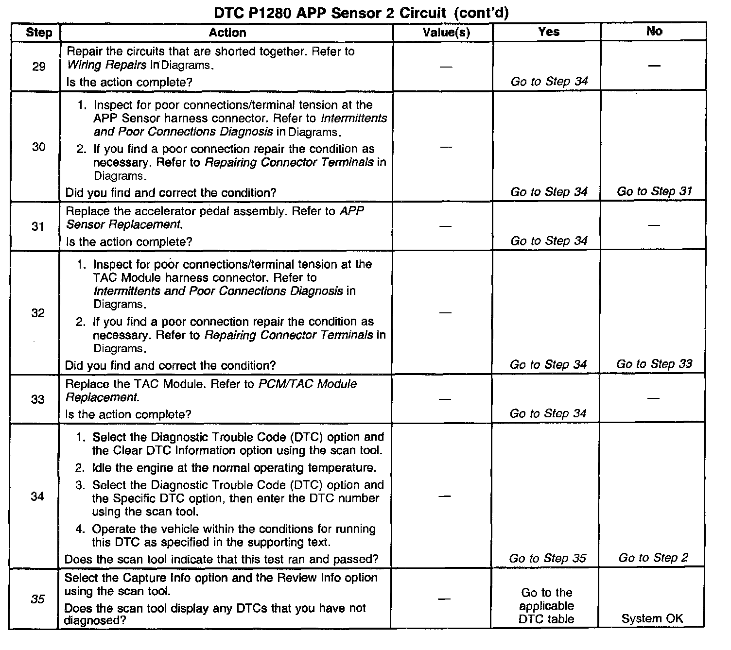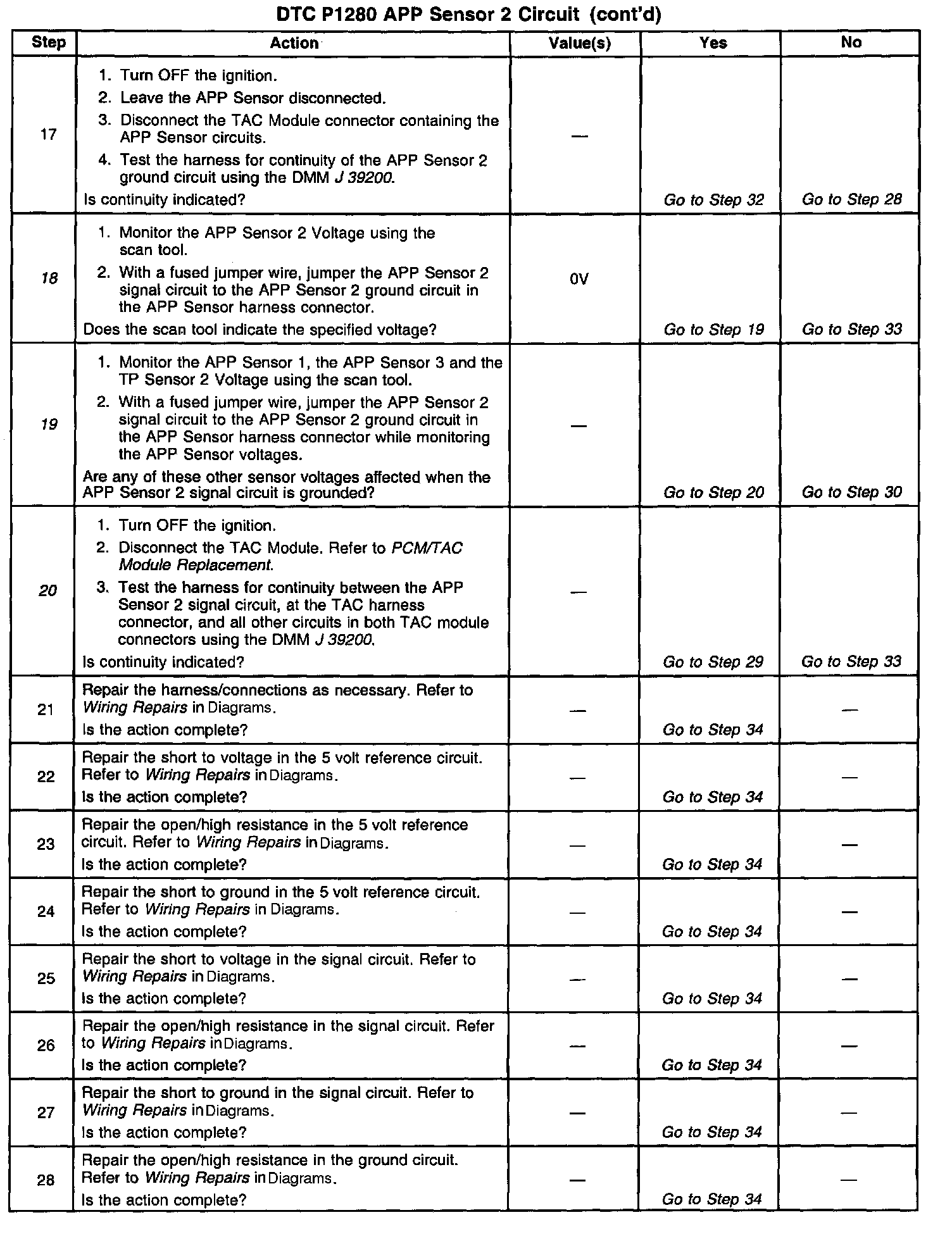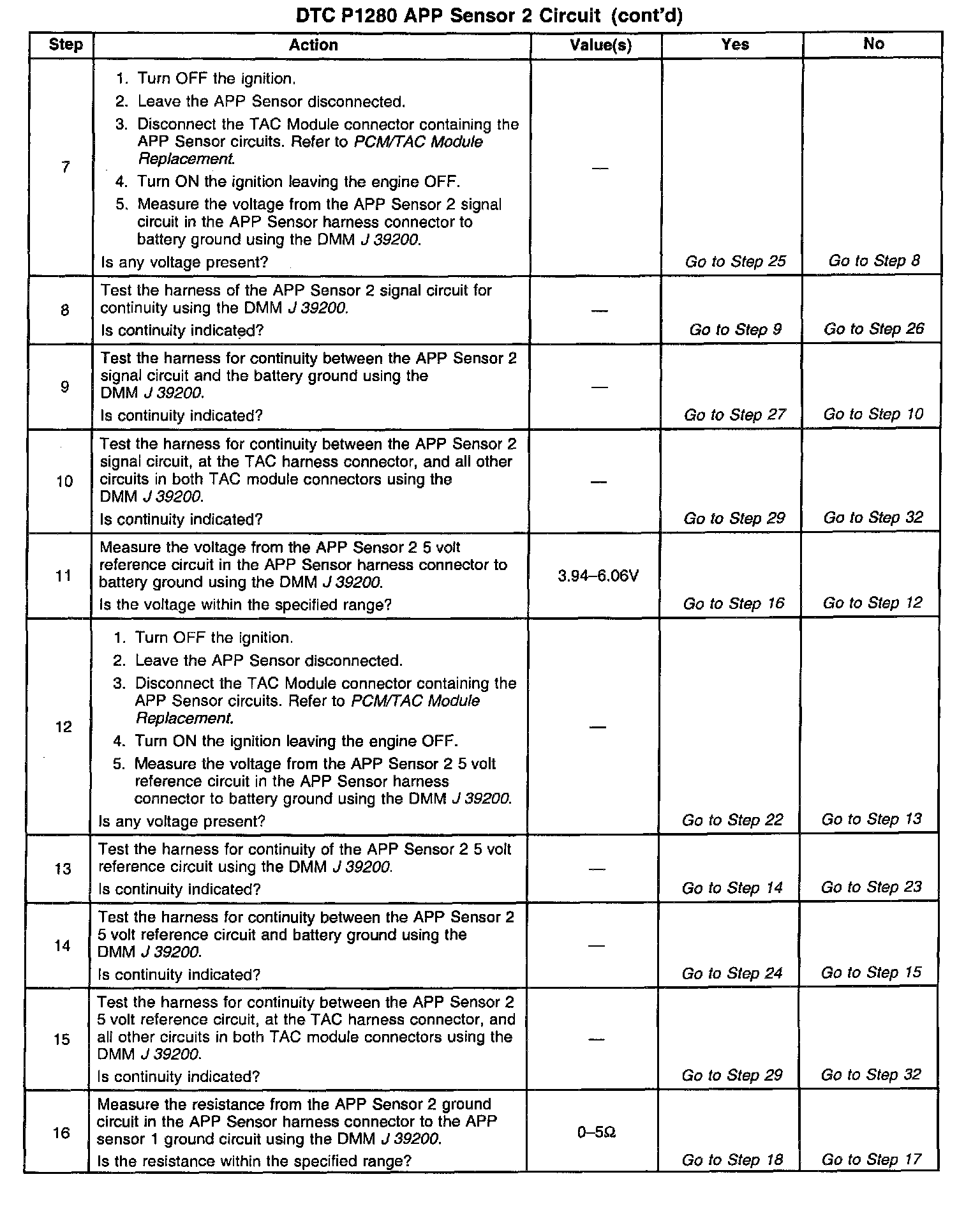 19. here are three separate 5 volt reference sources within the TAC Module. TP Sensor 1 and APP Sensor 1 share one 5 volt reference source, TP Sensor 2 and APP Sensor 2 share another common 5 volt reference source and APP Sensor 3 uses the third by itself. This test determines whether the signal circuit is shorted to any one of the 5 volt reference circuits. If a short exists, the corresponding sensor voltage will be pulled low.