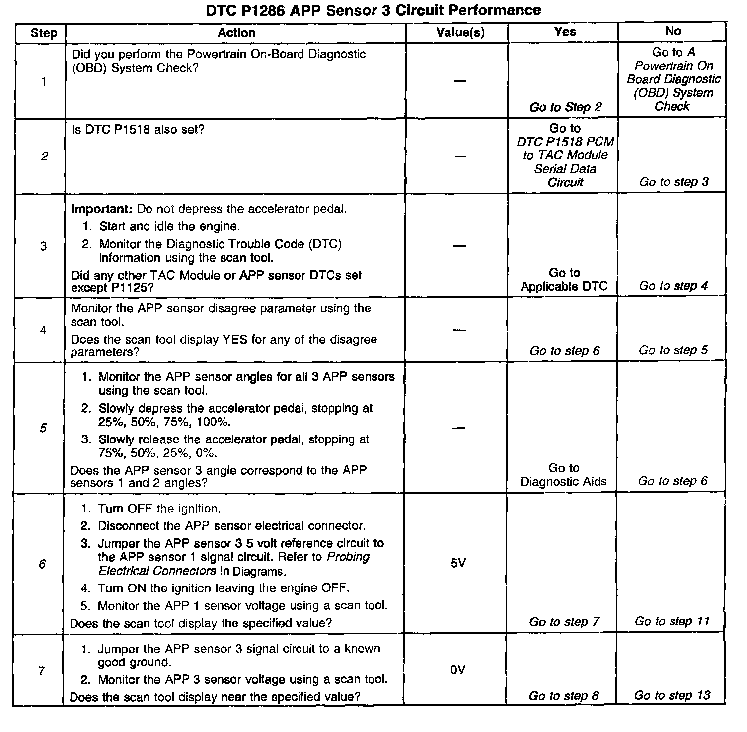 5. This step isolates an internal APP sensor failure. The condition may only occur at a certain accelerator pedal position. Monitoring the APP angles for sensor 1 and sensor 2 is an accurate way of verifying the actual position of the pedal. The APP angles for all 3 sensors should be within a few percent of each other. When the pedal is at rest the APP angle for all 3 sensors should be 0 percent, when the pedal is fully depressed all APP angles should be 100 percent.