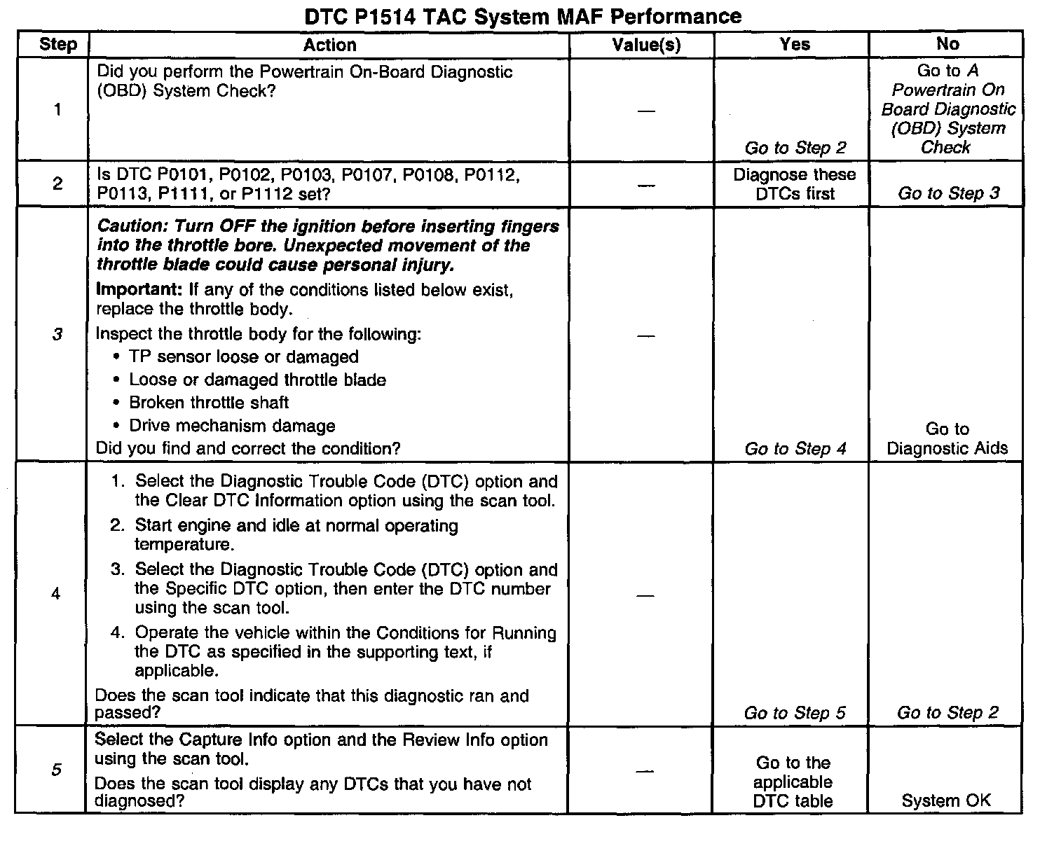 3. Physically/visually inspect the throttle body assembly and correct any problems that you observe. Manually move the throttle blade from closed to Wide Open Throttle (WOT). You should not need to use excessive force. The throttle blade should move smoothly through the full range and should return to a slightly open position on its own.