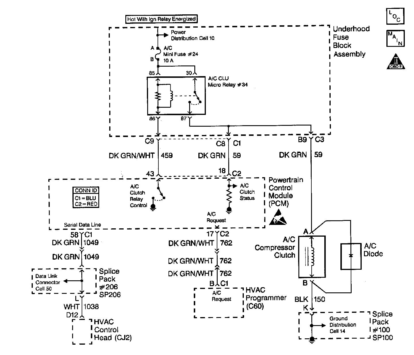 The PCM activates the A/C clutch relay when the PCM detects an A/C request signal. When the PCM activates the relay, voltage should be present at both the A/C compressor clutch and the A/C clutch status circuit at the PCM. The PCM monitors the A/C status circuit for voltage after the clutch is enabled. If the PCM does not detect a voltage this DTC sets.