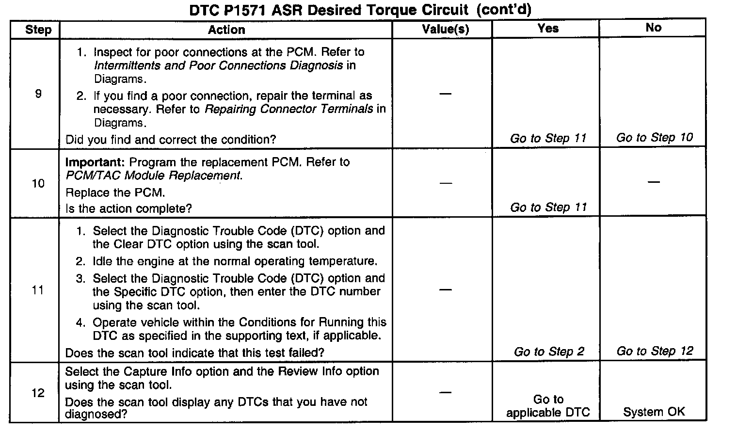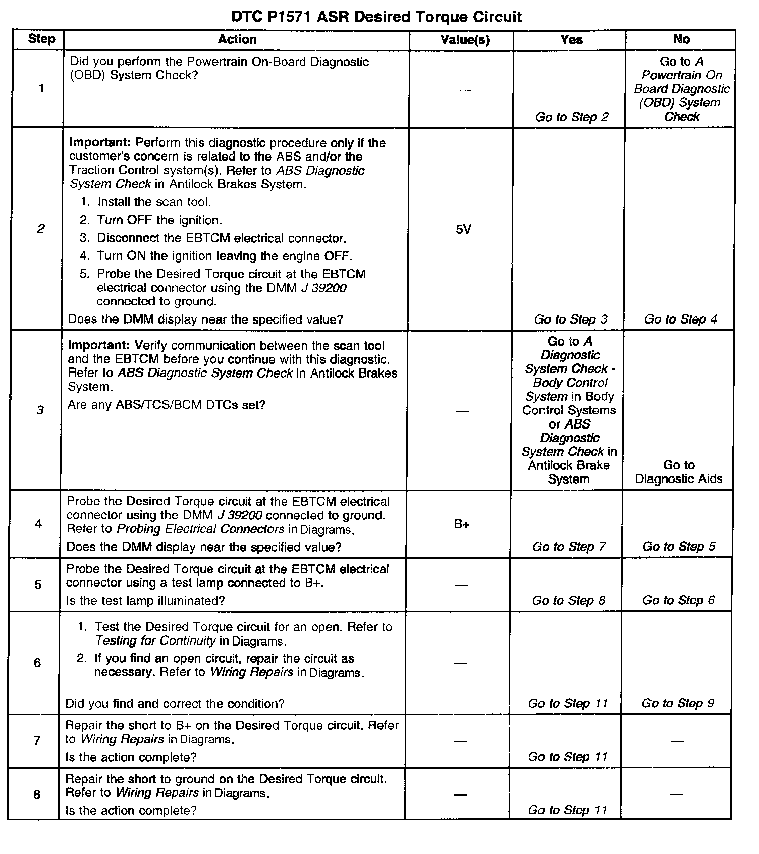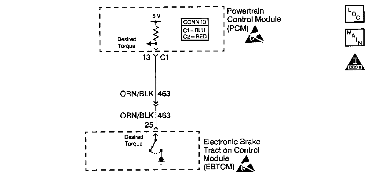 The PCM supplies 5 volts on the desired torque circuit to the Electronic Brake and Traction Control Module (EBTCM). The EBTCM toggles this 5 volt signal to a ground in order to produce a duty cycle signal. The signal is proportional to the amount of engine output torque reduction requested by the EBTCM. The EBTCM supplies this signal when it detects a wheel slip. In order to reduce engine output torque, the PCM reduces the amount of spark advance and in some cases, the PCM disables a number of fuel injectors. This diagnostic tests for a Desired Torque signal failure. If the PCM does not receive the Desired torque signal, this DTC sets.