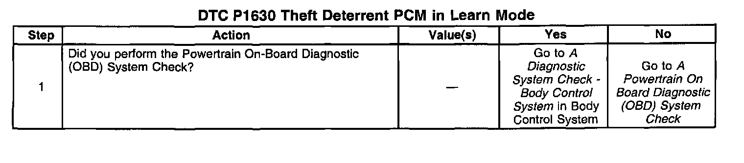 ^ A DTC 1630 is a code used at the assembly plant, dealership, or repair facility which indicates that the system has enabled the learn mode. This means that the PCM is now ready to learn a new password from the BCM. This DTC sets because the BCM never sent a valid password to the PCM while in the learn mode. When this occurs, the vehicle is vulnerable to vehicle theft.