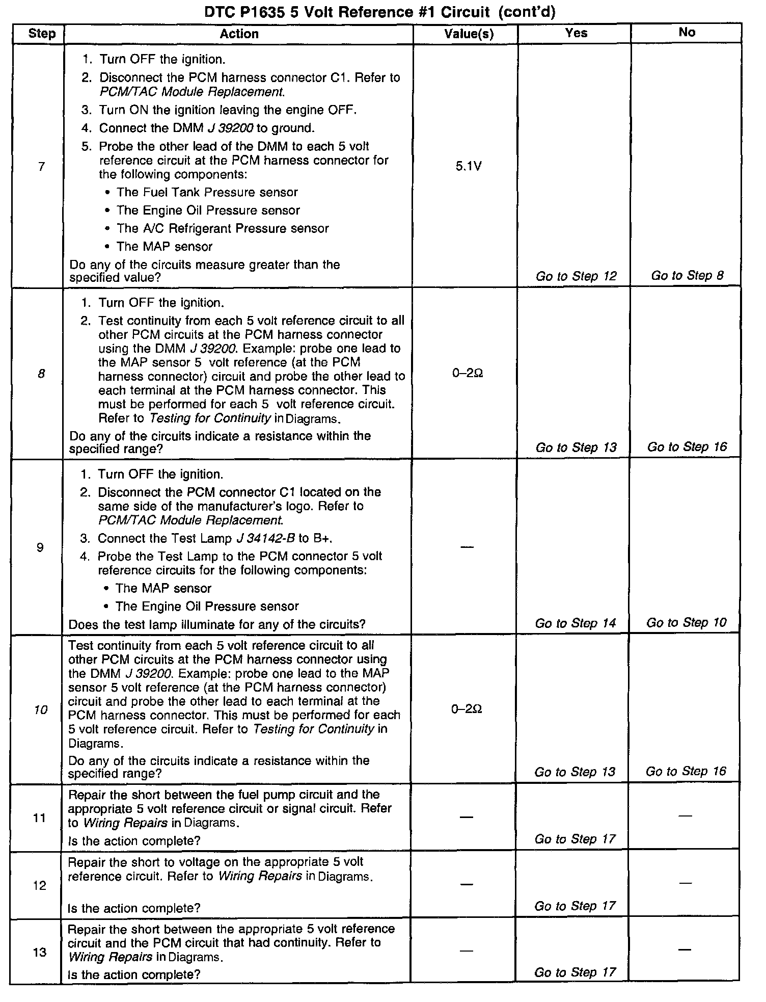 8. The 5 volt reference circuits may be shorted to another PCM circuit. The shorted circuit may not be apparent when the PCM harness connector is disconnected. Testing continuity from each 5 volt reference circuit isolates the shorted circuit.