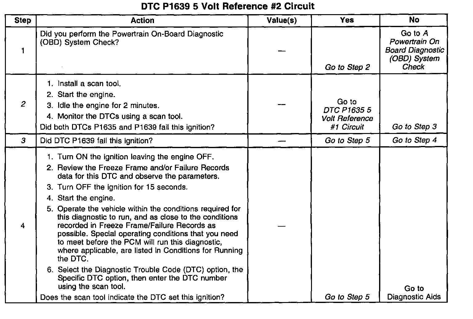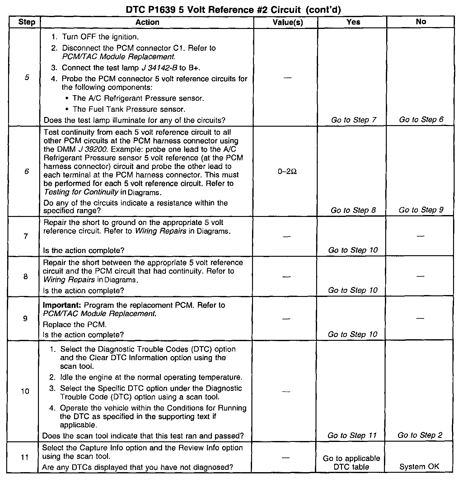 3. The 5 reference circuits for the sensors are connected together inside the PCM. When only P1639 is set, this indicates a short to ground on one of the 5 reference circuits for the A/C Refrigerant Pressure sensor or the Fuel Tank Pressure sensor.