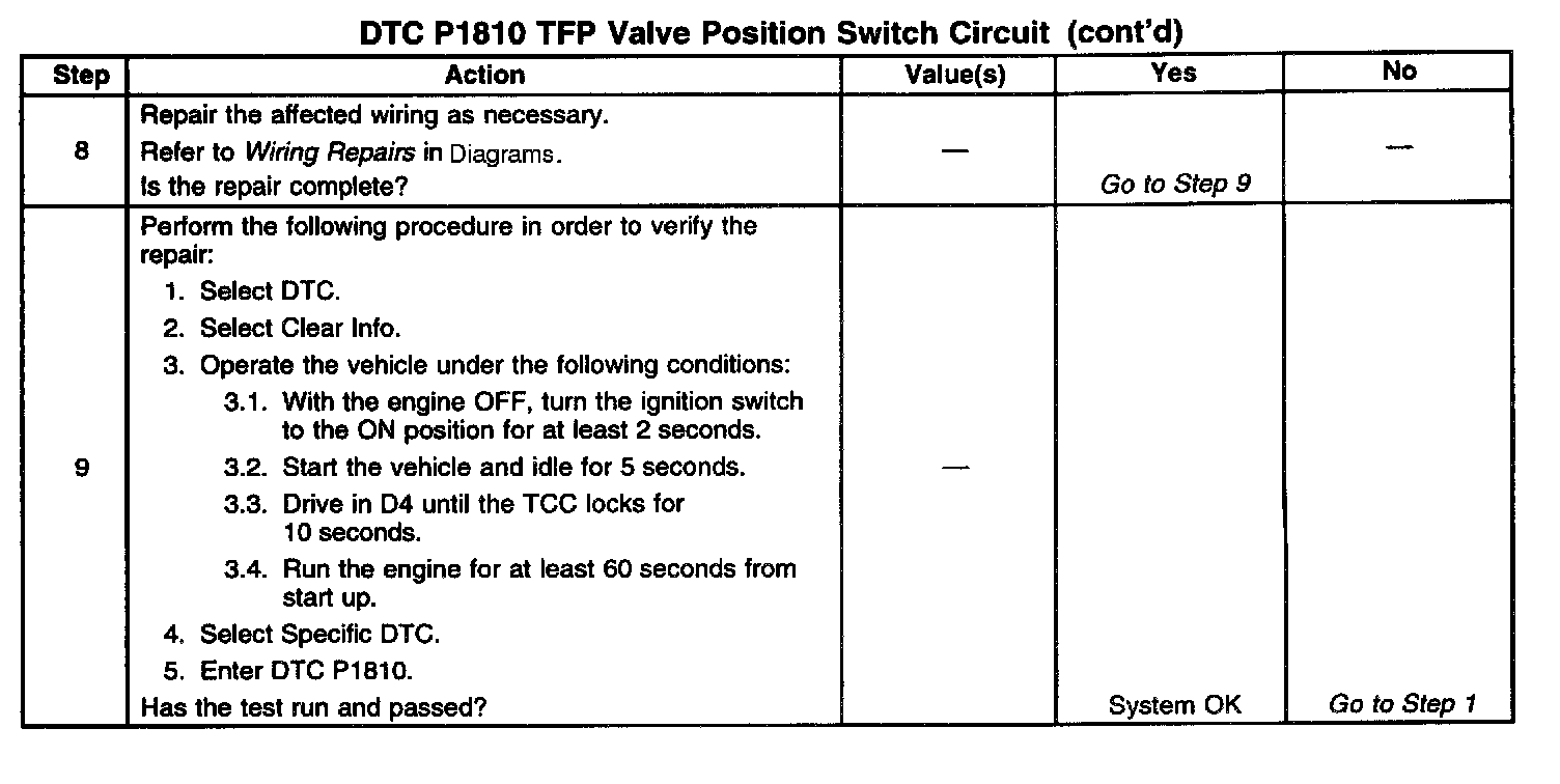 When the PCM detects an invalid state of the TFP manual valve position switch or the TFP manual valve position switch circuit by deciphering the TFP manual valve position switch inputs, then DTC P1810 sets. DTC P1810 is a type B DTC.