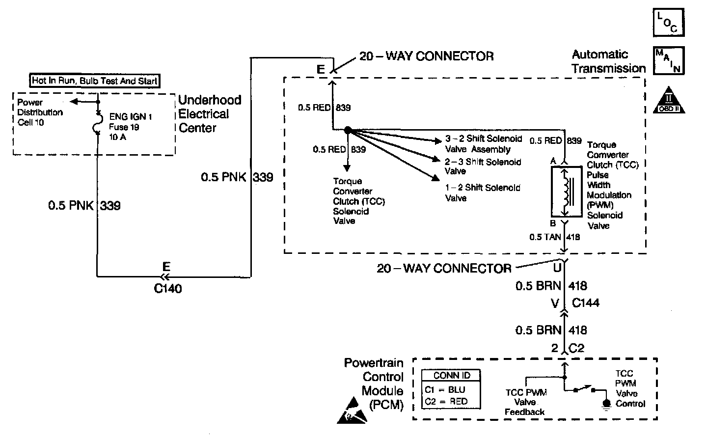 The torque converter clutch pulse width modulation (TCC PWM) solenoid valve controls the fluid acting on the converter clutch valve. The converter clutch valve controls the TCC application and release. The solenoid attaches to the control valve body within the transmission. The solenoid receives ignition voltage through circuit 339. The powertrain control module (PCM) controls the solenoid by providing a ground path on circuit 418. Current flows through the solenoid coil according to the duty cycle (percentage of ON and OFF time). The TCC PWM solenoid valve provides a smooth engagement of the torque converter clutch by operating during a duty cycle percent of ON time.