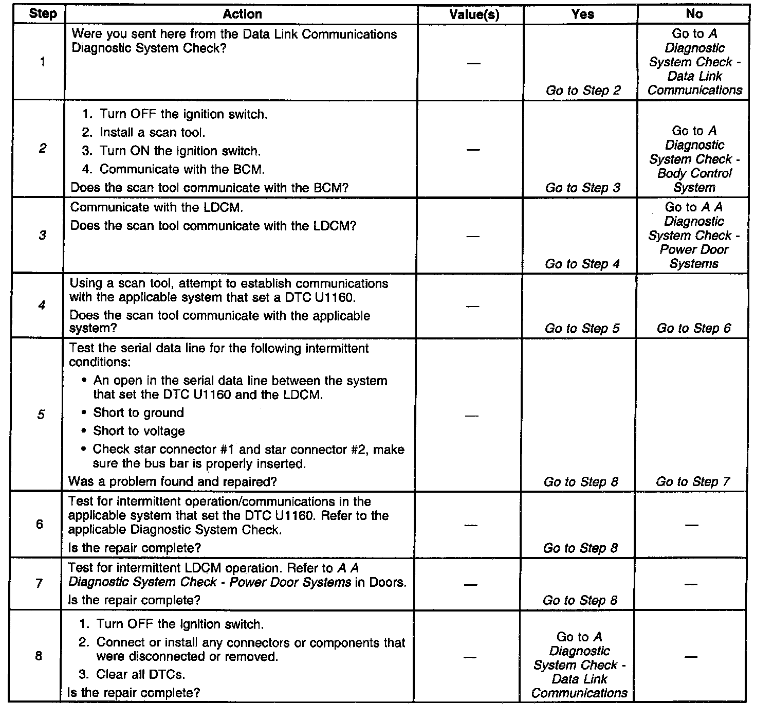 4. This test determines if communications can be established between the scan tool and the system that set the DTC U1160. If the scan tool intermittently cannot communicate with the system that stored a DTC U1160, the LDCM is not cause the malfunction and the applicable system must be diagnosed first. Refer to the appropriate Diagnostic System Check.