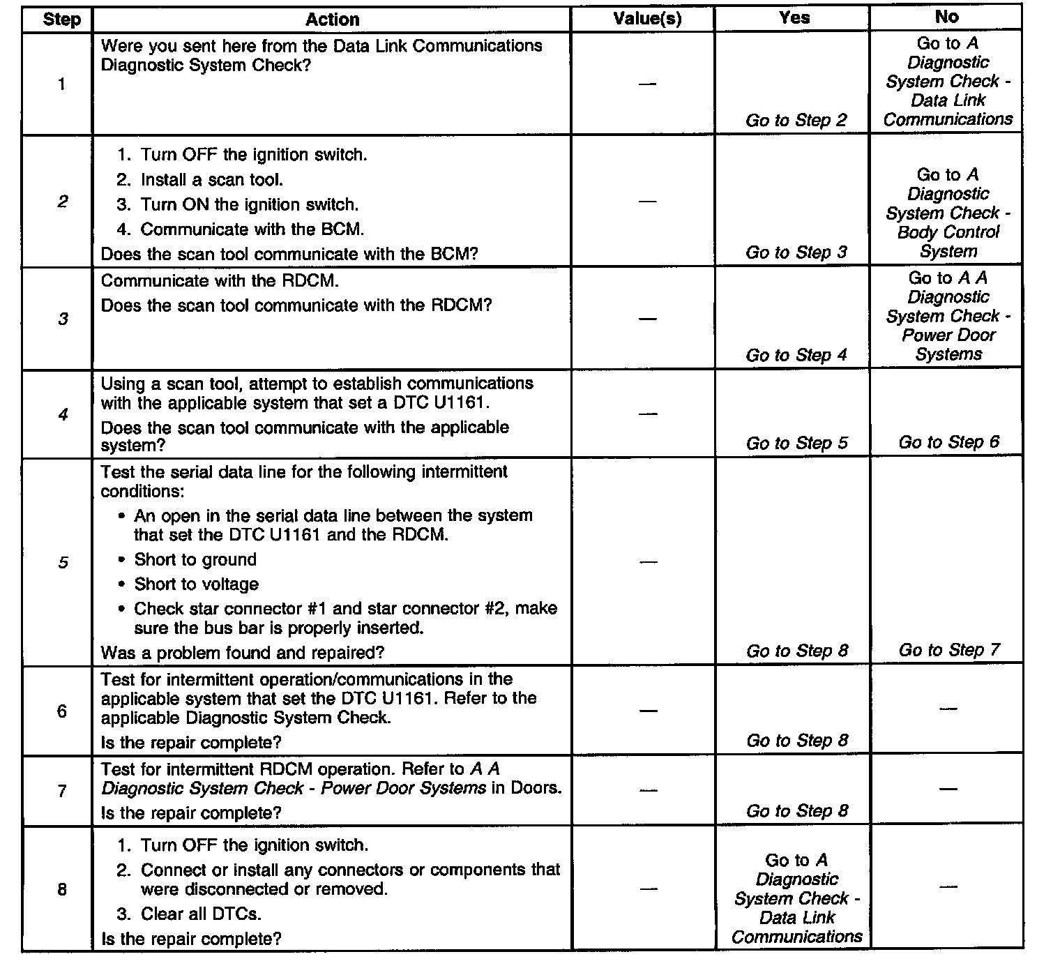 4. This test determines if communications can be established between the scan tool and the system that set the DTC U1161. If the scan tool intermittently cannot communicate with the system that stored a DTC U1161, the RDCM is not cause the malfunction and the applicable system must be diagnosed first. Refer to the appropriate Diagnostic System Check.