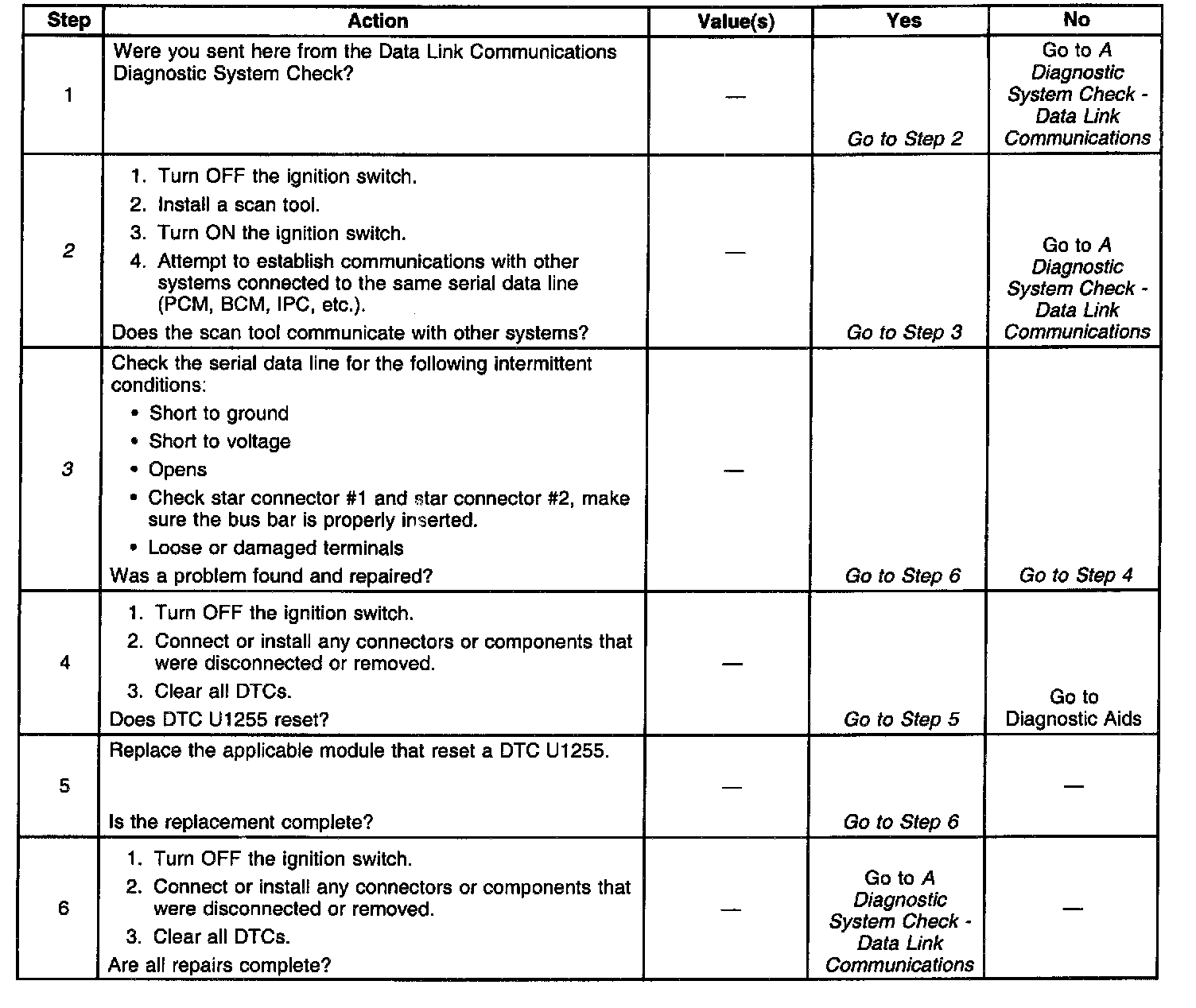 ^ If the serial data line is shorted to ground or shorted to voltage, all systems connected to the same serial data line will not be able to communicate properly. Systems capable of storing loss of communication DTCs (DTCs with the letter U as a prefix) will have these codes stored in their memory. If a DTC U1255 is stored in a system, check the serial data line circuit for an intermittent open or short (to ground or voltage). After repairing a DTC U1255, clear all DTCs from all systems capable of storing communication DTCs.