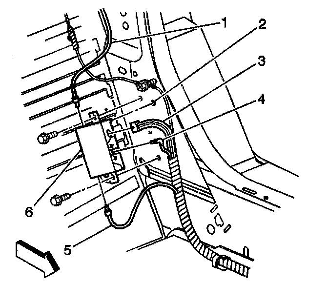 5. Remove the screws retaining the antenna module (6) to the lock pillar.