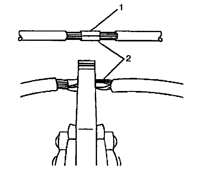 7. Center the splice clip (2) over the stripped wires (1) and hold the clip in place.