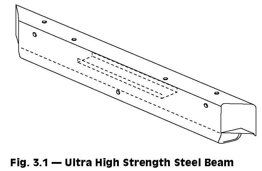 Front Bumper Impact BarThe front impact bar (bumper beam) is made of Ultra-High Strength steel. The impact bar is MIG welded to the mild steel frame rails. The impact bar can be repaired if damage excludes kinks, or damage which would require the use of heat to straighten.