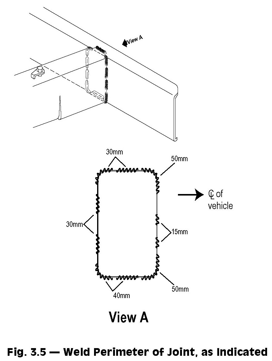 4. Position the bumper impact bar using three-dimensional measuring equipment and install per the original weld locations. Stitch weld around the 'fishmouth' joint. If no trace of the original welds are present, use Fig.3.5 as a guide for welding the side rails to the impact bar. This weld pattern will create a solid weld joint with minimal heat distortion.