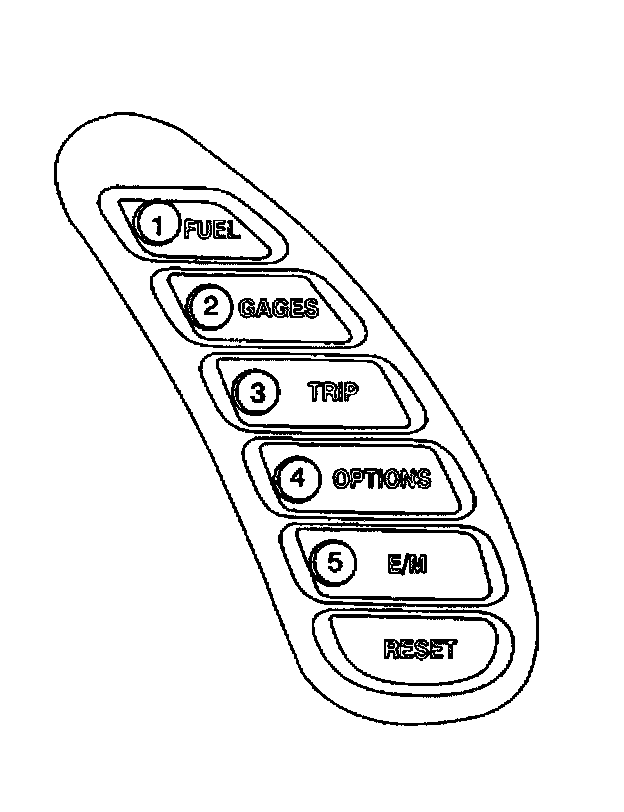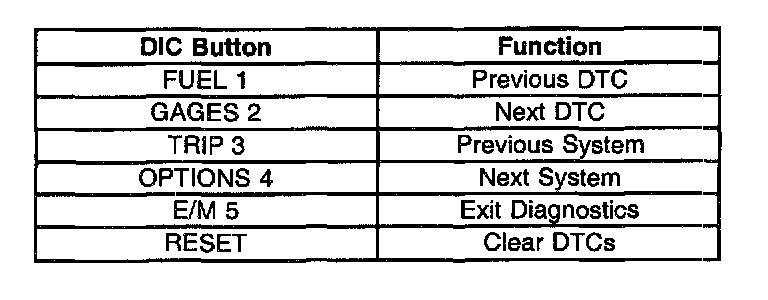 The manual display feature allows you to manually select each module DTC display function. The manual mode will automatically be entered after the automatic DTC display sequence is complete, or can be entered at any time during the automatic mode by pressing any button on the Driver Information Center (DIC) except the E/M 5 (E/M 5 button is used to exit the DIAGNOSTIC mode at any time). When the manual mode is selected, the IPC will display the MANUAL DIAGNOSTICS mode message for 2 seconds, or until any button on the DIC except the E/M 5 is pressed. After the MANUAL DIAGNOSTICS mode message is displayed, the IPC will display the first system abbreviation and quantity of codes stored for that system, then the IPC will wait for further instructions. The buttons on the DIC provide the following functions when operating the on-board diagnostic feature in the manual mode:DIC Button Functions