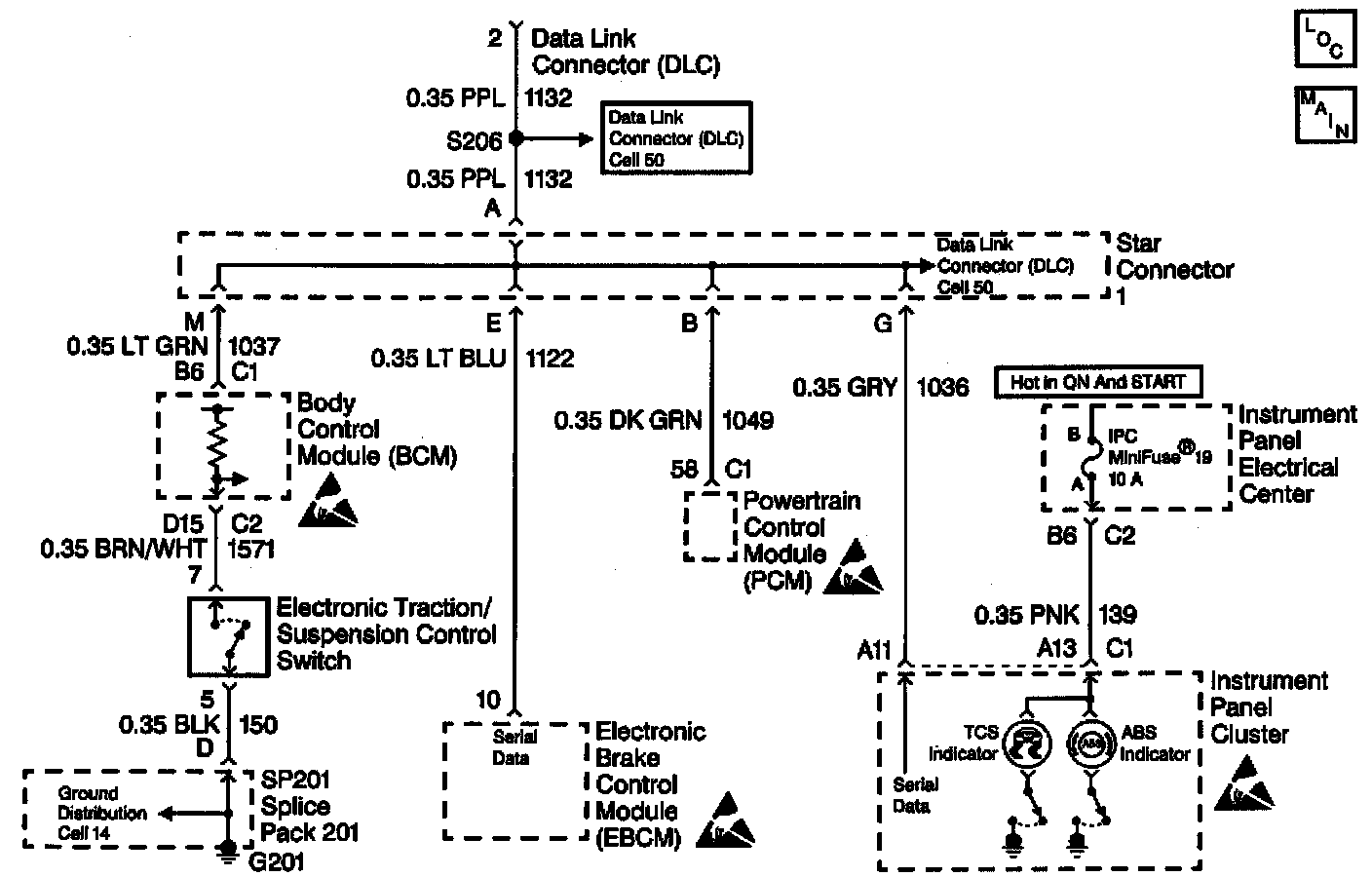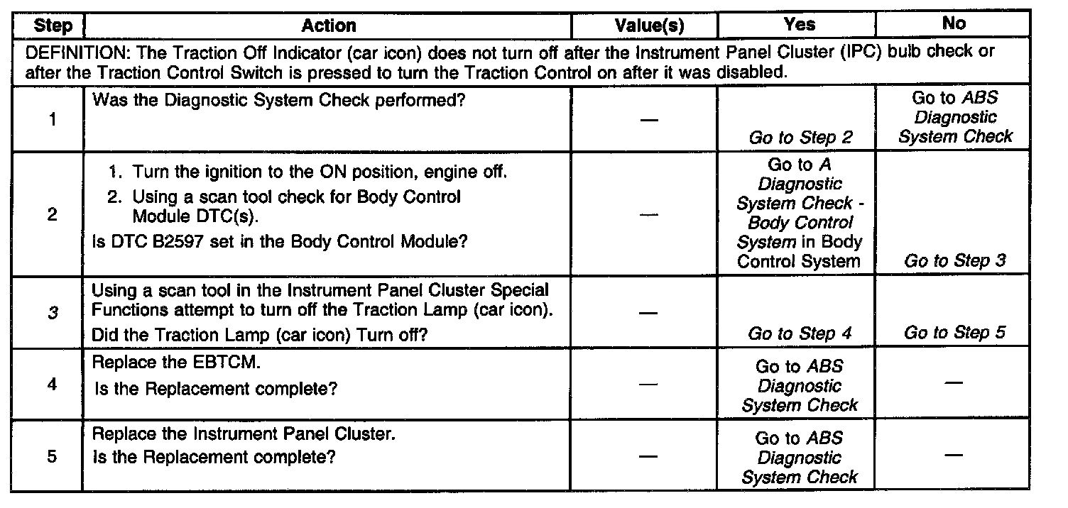 3. Checks if the Instrument Panel Cluster (IPC) has the ability to turn the Traction Off indicator off or if the Electronic Brake and Traction Control Module (EBTCM) is sending an incorrect command to turn the Traction Off indicator on.
