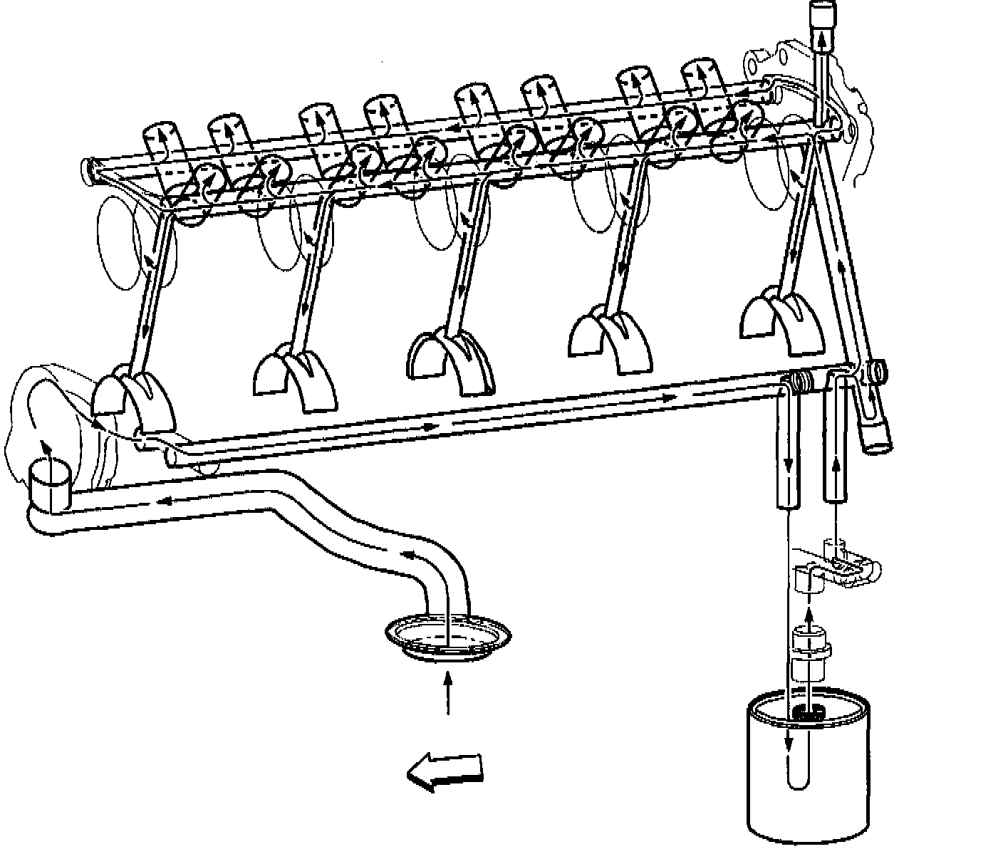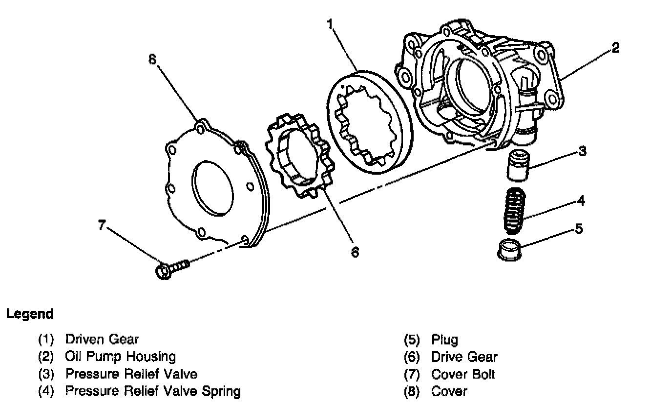 Engine lubrication is supplied by a gerotor type oil pump assembly. The pump is mounted on the front of the engine block and driven directly by the crankshaft sprocket. The pump gears rotate and draw oil from the oil pan sump through a pick-up screen and pipe. The oil is pressurized as it passes through the pump and is sent through the engine block oil galleries. Contained within the oil pump assembly is a pressure relief valve that maintains oil pressure within a specified range. Pressurized oil is directed through the lower gallery to the full flow oil filter where harmful contaminants are removed. A bypass valve is incorporated into the oil pan which will permit oil flow in the event the filter becomes restricted. At the rear of the block, oil is then directed to the upper main oil galleries which are drilled just above the camshaft assembly. From there oil is then directed to the crankshaft and camshaft bearings. Oil that has entered the upper main oil galleries also pressurizes the valve lifter assemblies and is then pumped through the pushrods to lubricate the valve rocker arms and valve stems. Oil returning to the pan is directed by the crankshaft oil deflector. Oil temperature, pressure and crankcase level are each monitored by individual sensors.