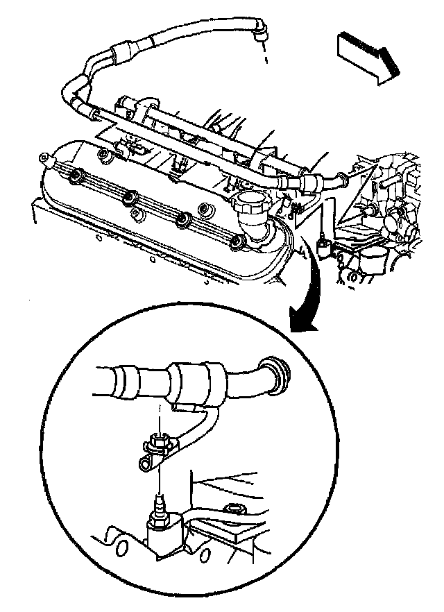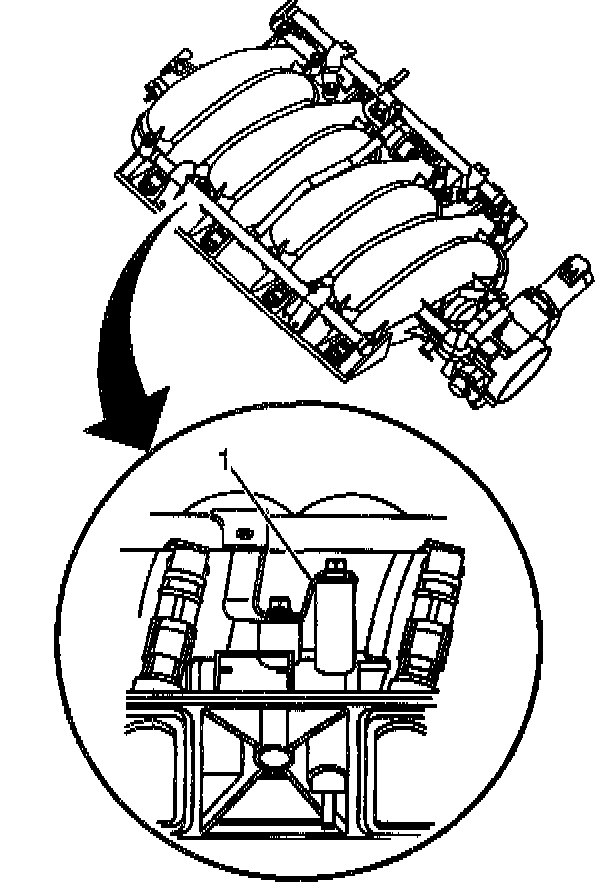 7. Note the location of the fuel -rail ground. strap (1) on the intake manifold.