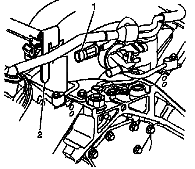 2. Disconnect the knock sensor wire harness connector (1) from the fuel rail stop bracket (2).