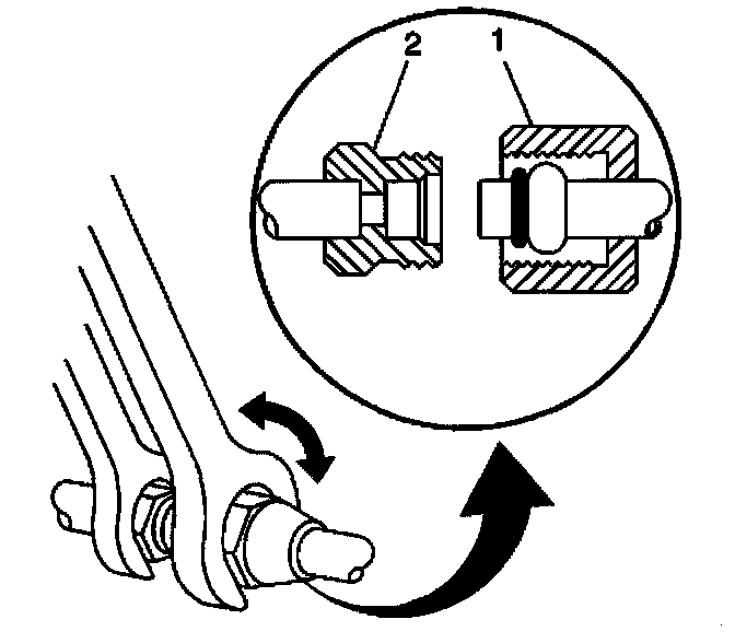 12. Using a back-up wrench on the accumulator fitting (2), secure the accumulator hose fitting (1) to the accumulator.