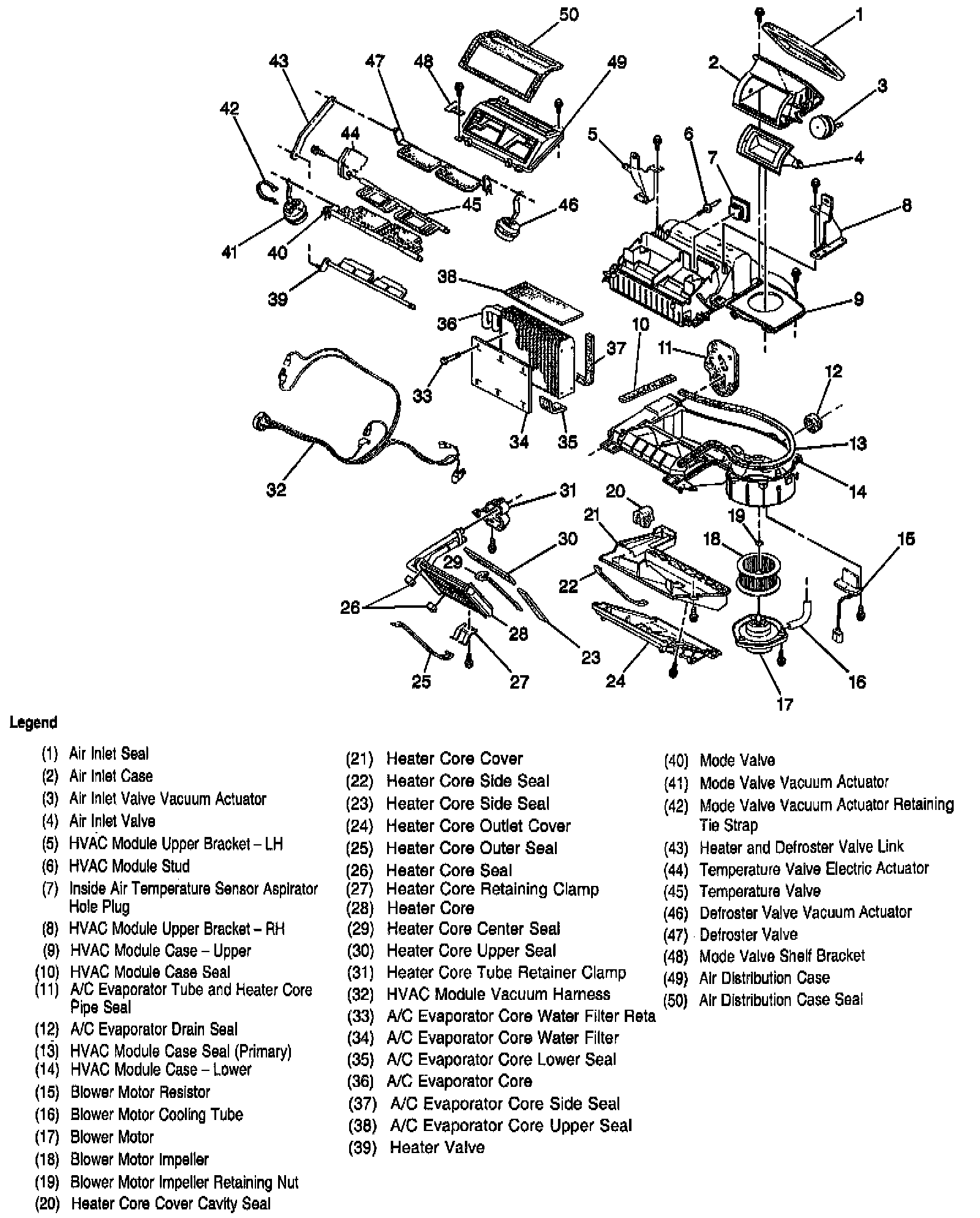 Air enters the Heater, Ventilation And Air Conditioning (HVAC) module where it may be cooled for air conditioning or defrost modes, and then heated as necessary before being sent to the proper outlets for discharge into the passenger compartment. Within the HVAC module, valves (doors) guide the airflow in response to the position of the mode control on the HVAC control head.